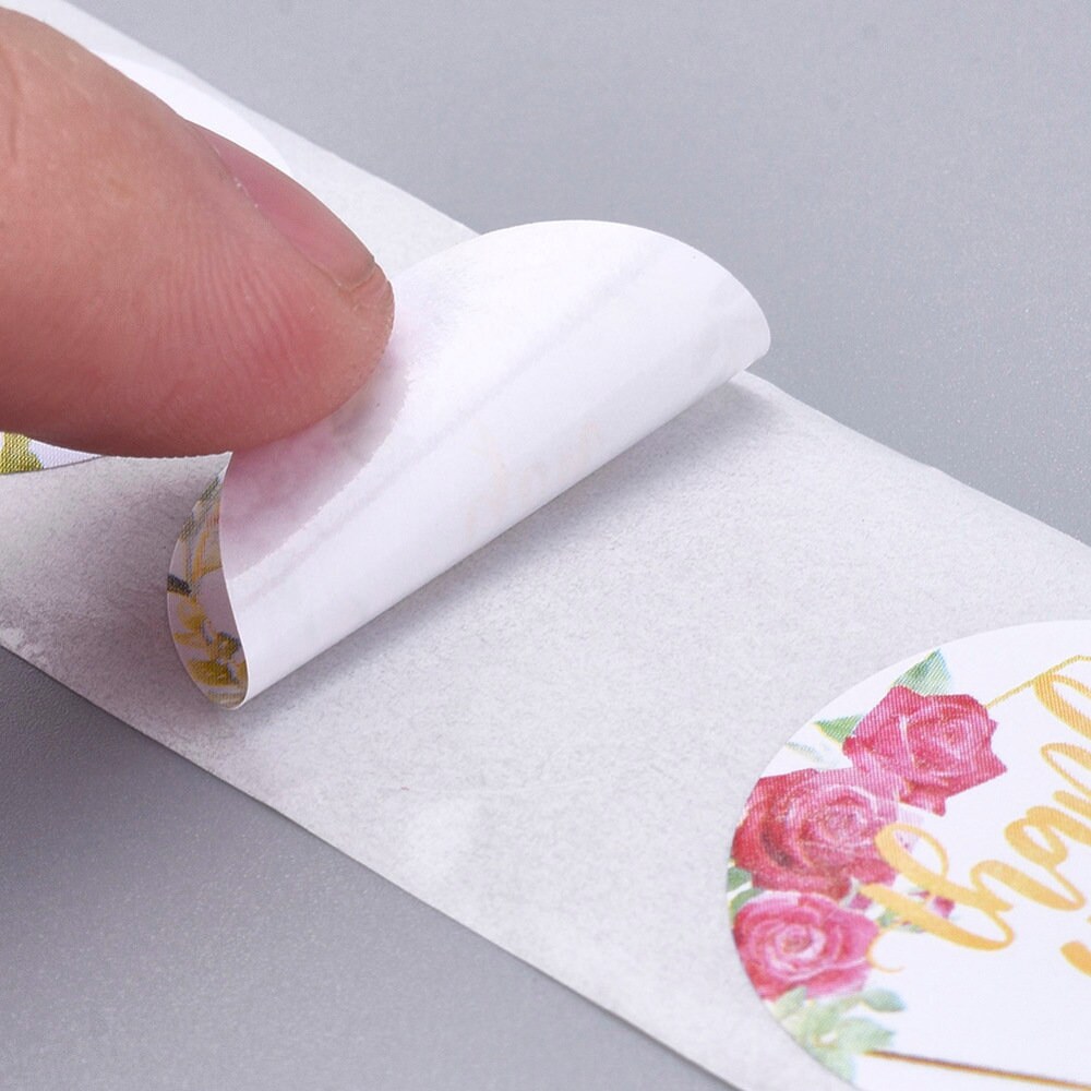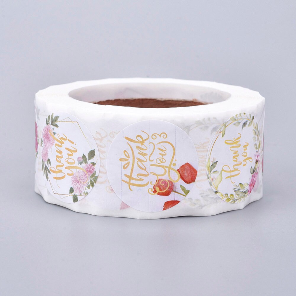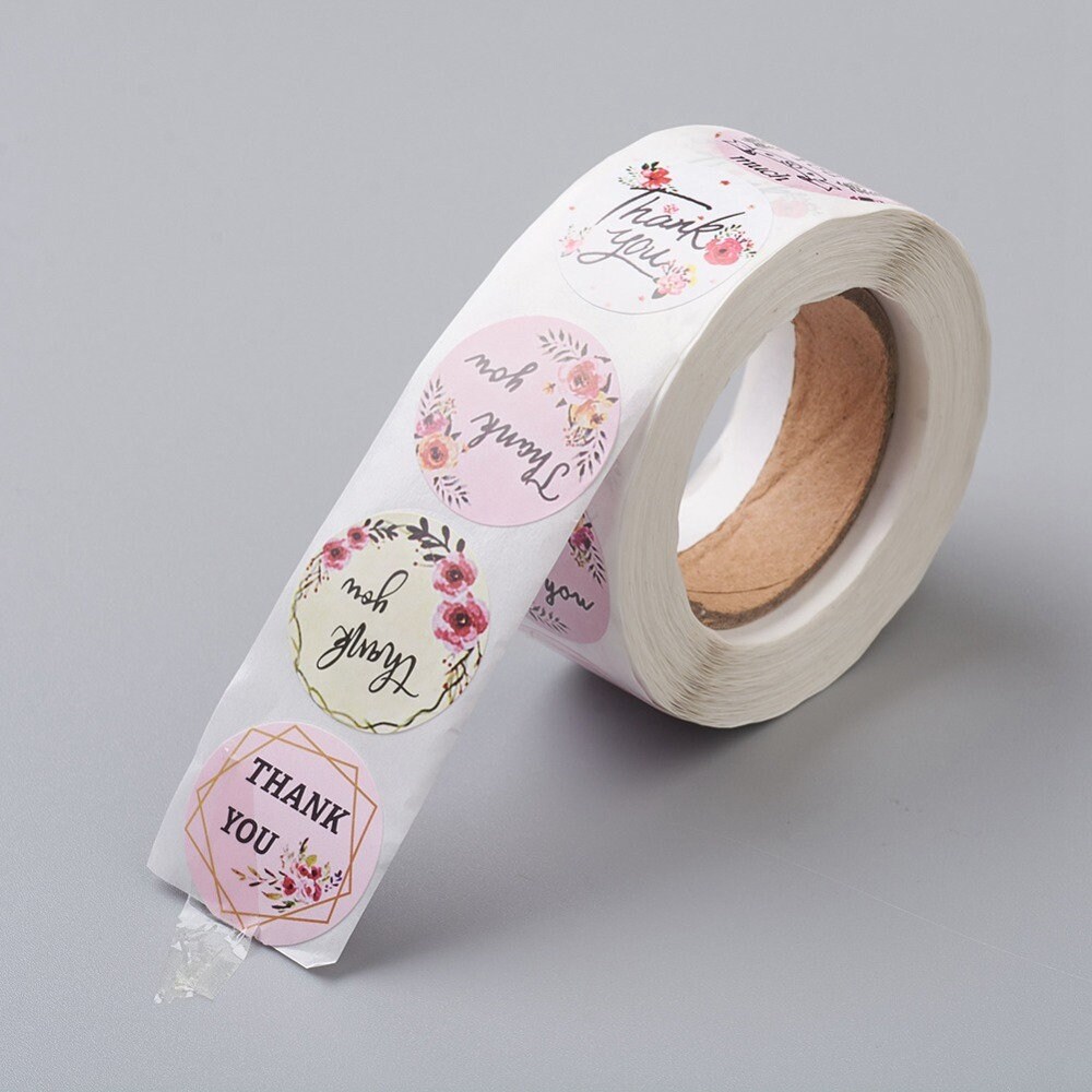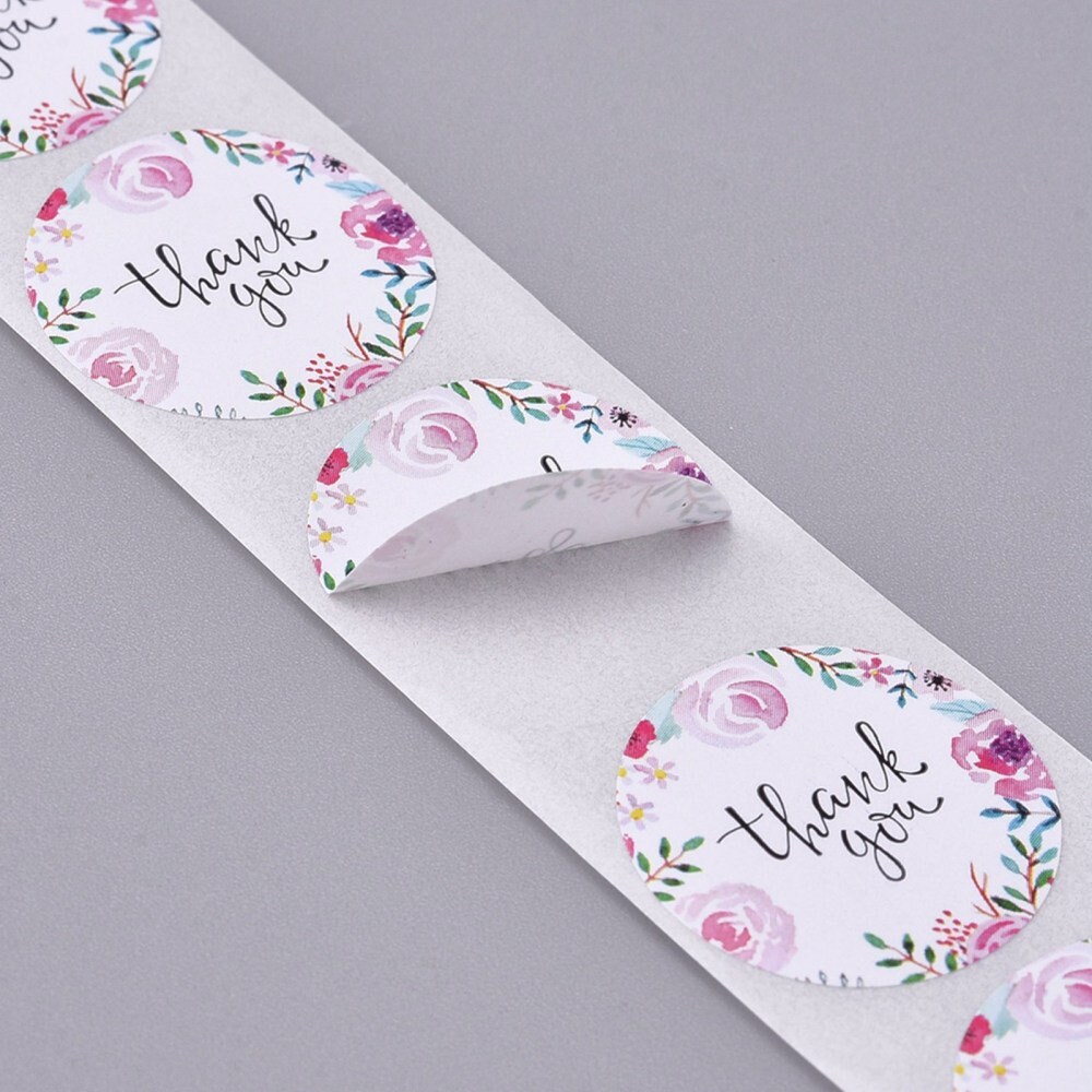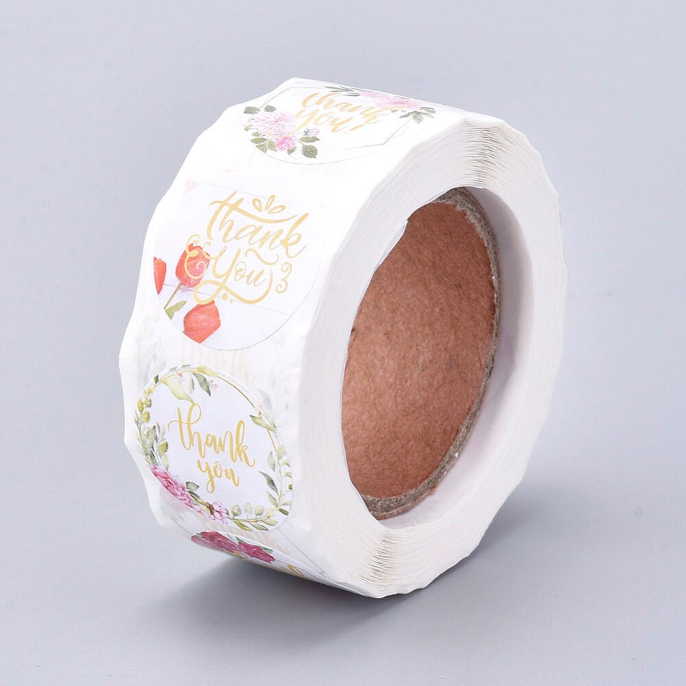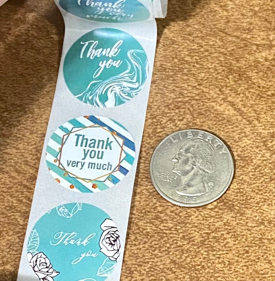Thank you stickers. Great for sealing cards, placing on packages, and more! Sold per roll. Each roll has about 500 stickers. Choose from a variety of self-adhesive Thank You Stickers. Stickers measure 25mm in diameter which is about the size of a quarter.