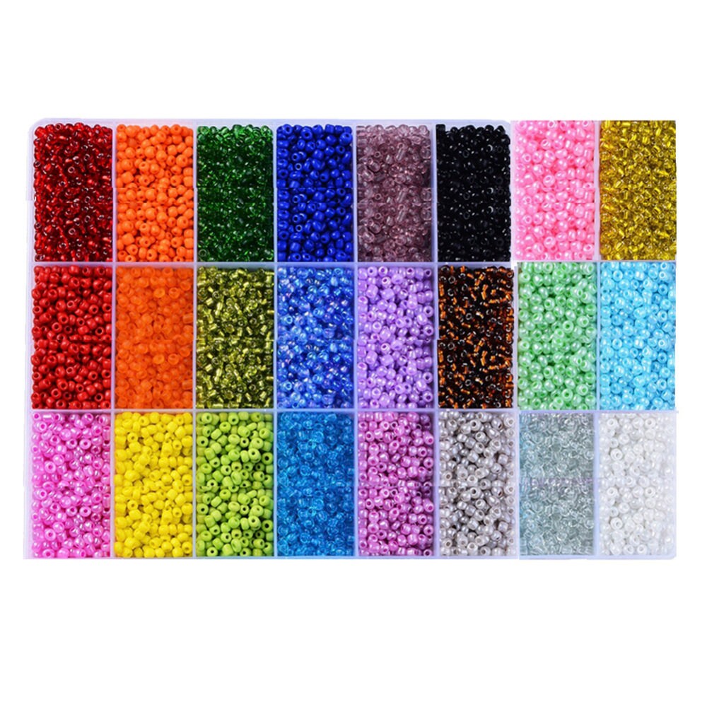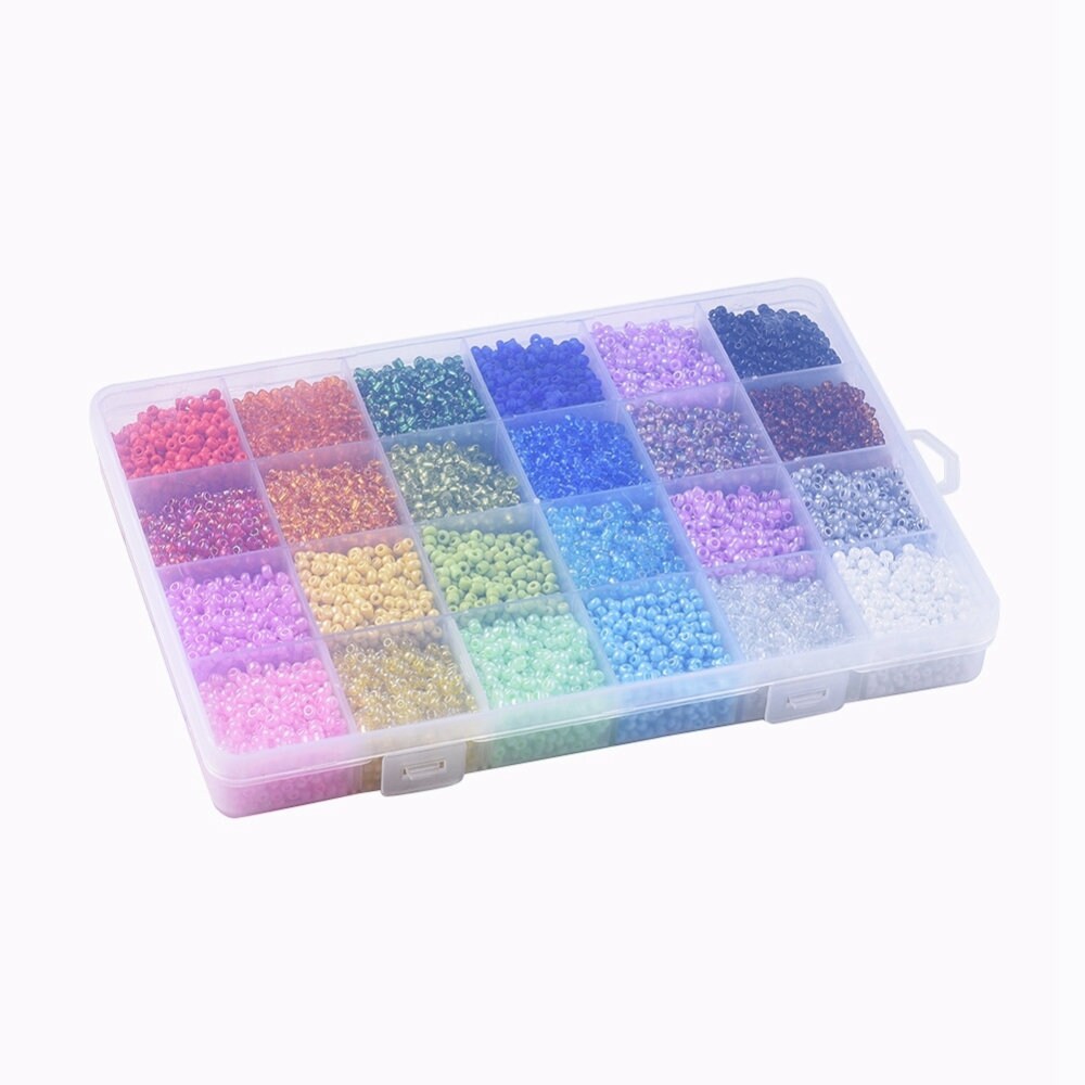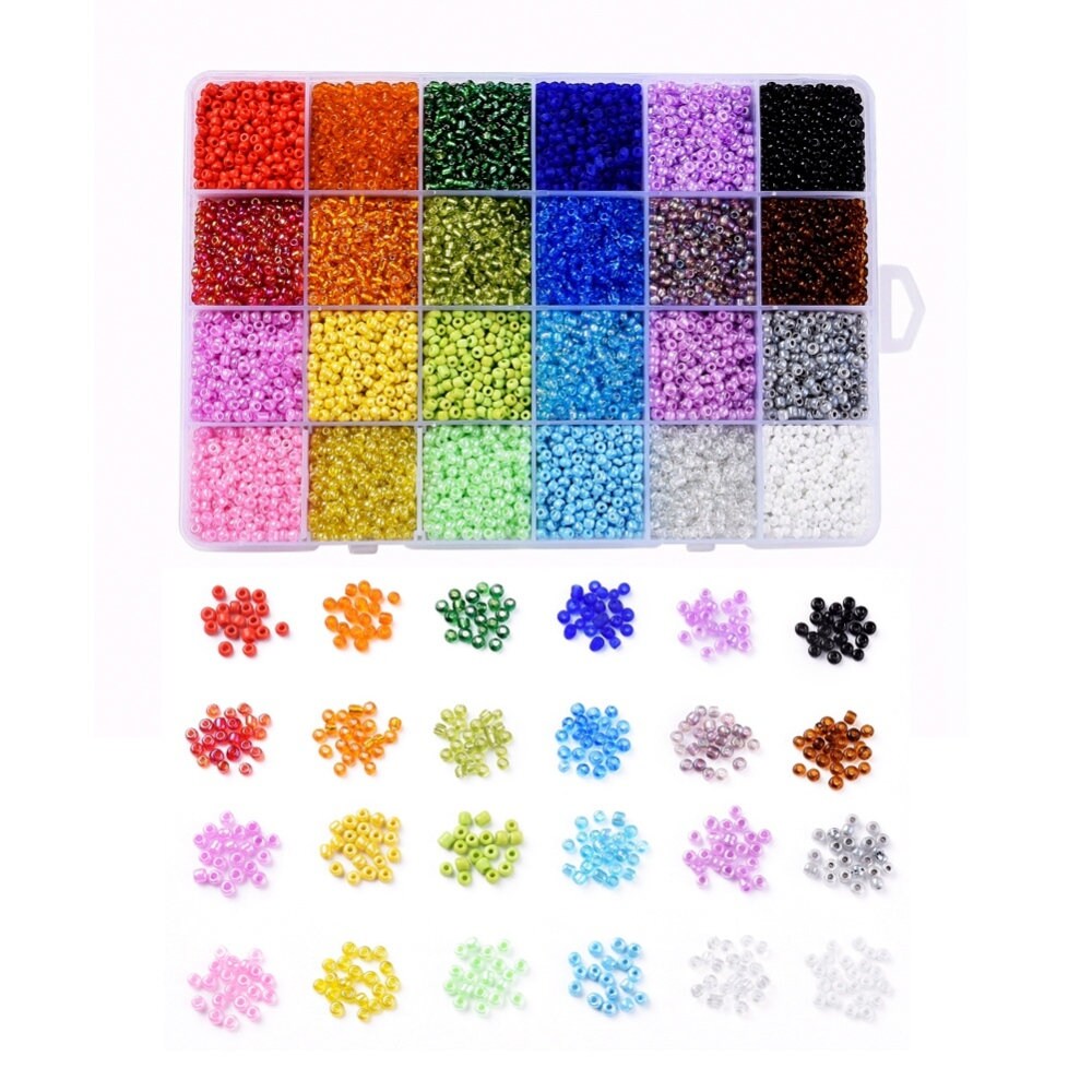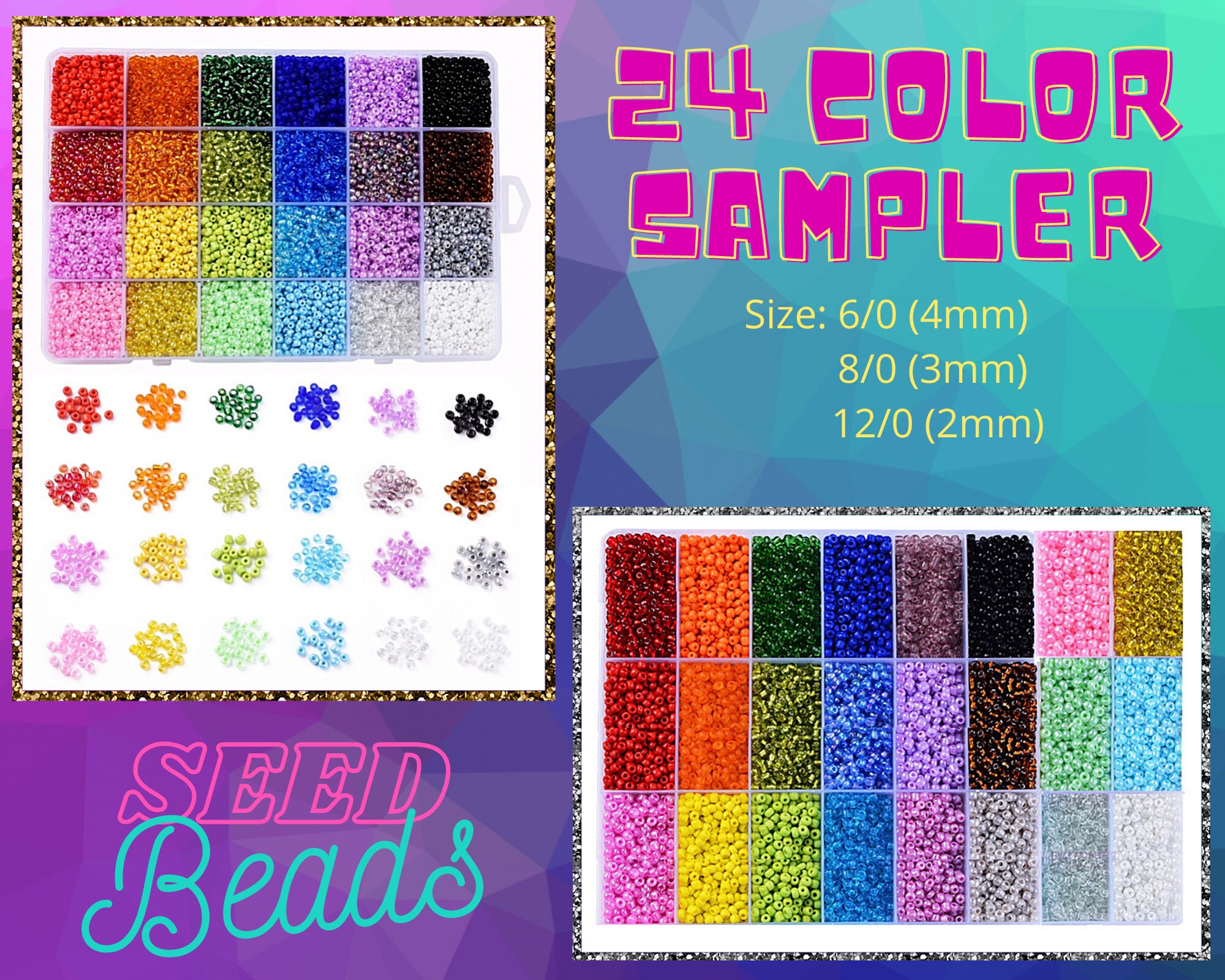 Great kit offering a variety of colors and finish. *Please note that beads will not completely fill the compartments.*Choose between sizes 12/0 (2mm), 8/0 (3mm) or 6/0 (4mm) seed bead kits. Comes with 24 different colors and convenient storage container. Check below for specifics on each product. Size 8/0 Kit has about 288 grams of beads (about 7,200 pieces). Size 6/0 Kit has about 306 grams of beads (about 4,300 beads), and kit size 12/0 has about 288 grams of beads (about 43,200 beads). Keep in mind quantity of each bead varies based off the weight of the coating of each bead.