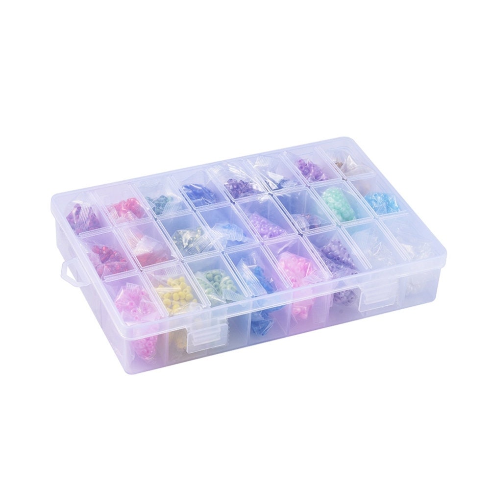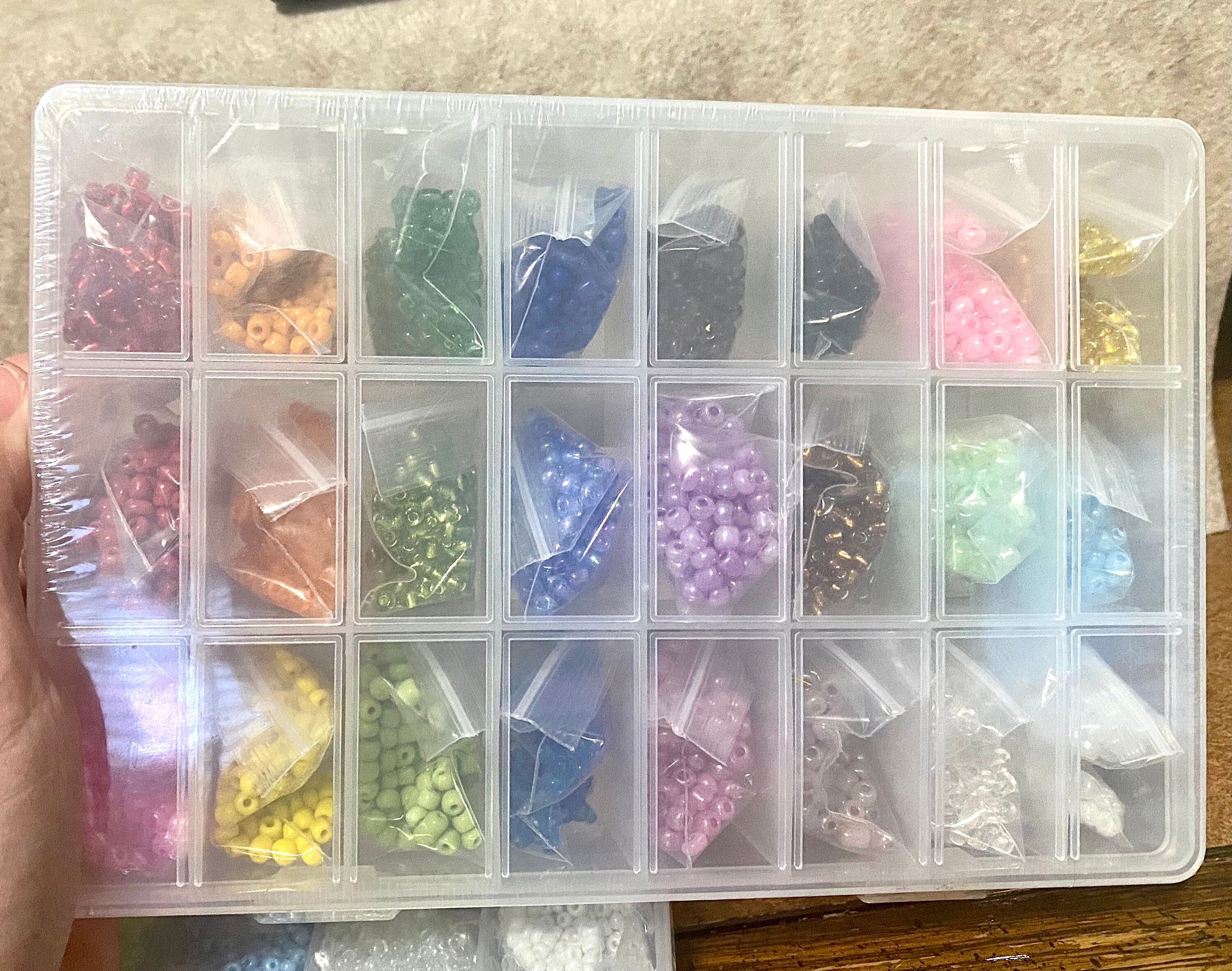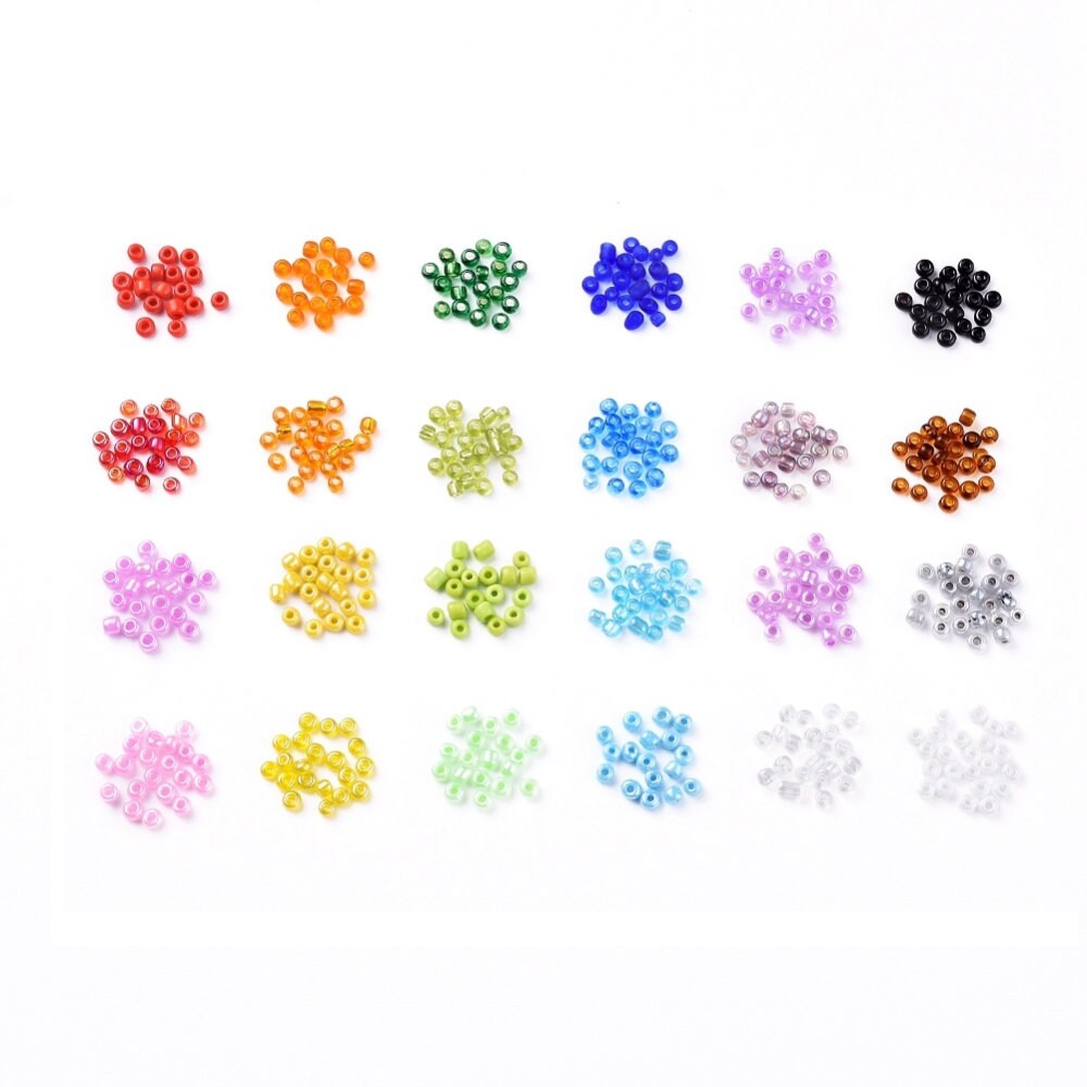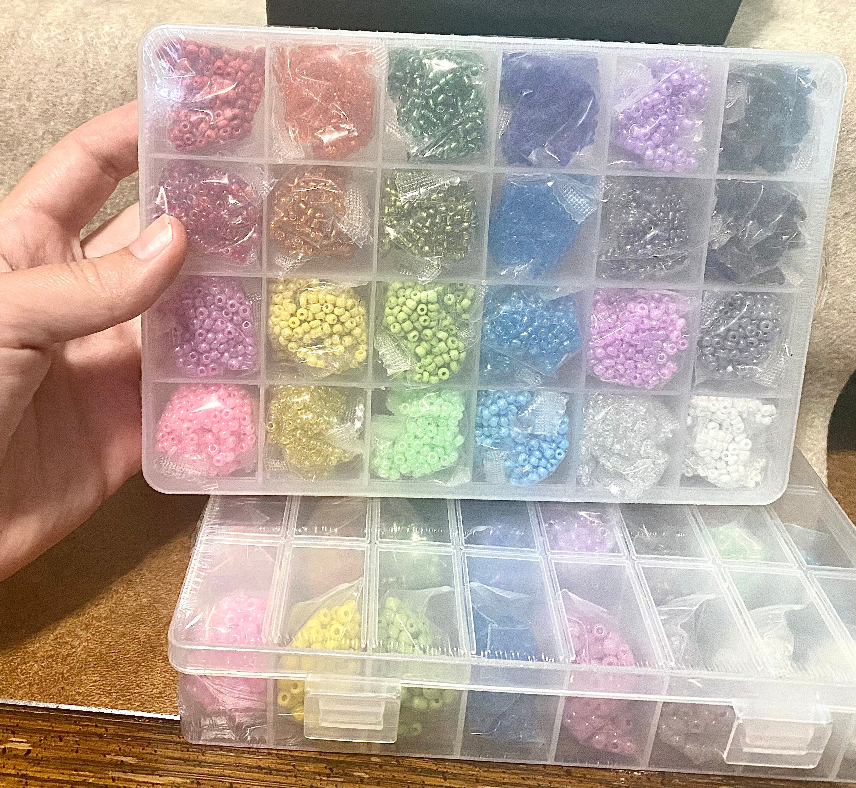 Great kit offering a variety of colors and finish. *Please note that beads will not completely fill the compartments.*Choose between sizes 12/0 (2mm), 8/0 (3mm) or 6/0 (4mm) seed bead kits. Comes with 24 different colors and convenient storage container. Check below for specifics on each product. Size 8/0 Kit has about 288 grams of beads (about 7,200 pieces). Size 6/0 Kit has about 306 grams of beads (about 4,300 beads), and kit size 12/0 has about 288 grams of beads (about 43,200 beads). Keep in mind quantity of each bead varies based off the weight of the coating of each bead.