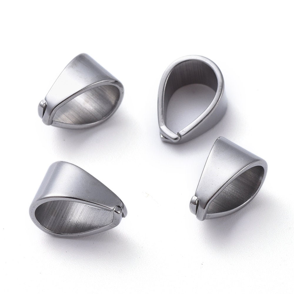 Choose from 5 or 10 Large Stainless Steel Snap Bails / Pinch Bails. Made from Stainless Steel and therefore highly tarnish and rust resistant. Steel/Platinum color. Use pinch bails for pendants, charms, beads, charms, and more!