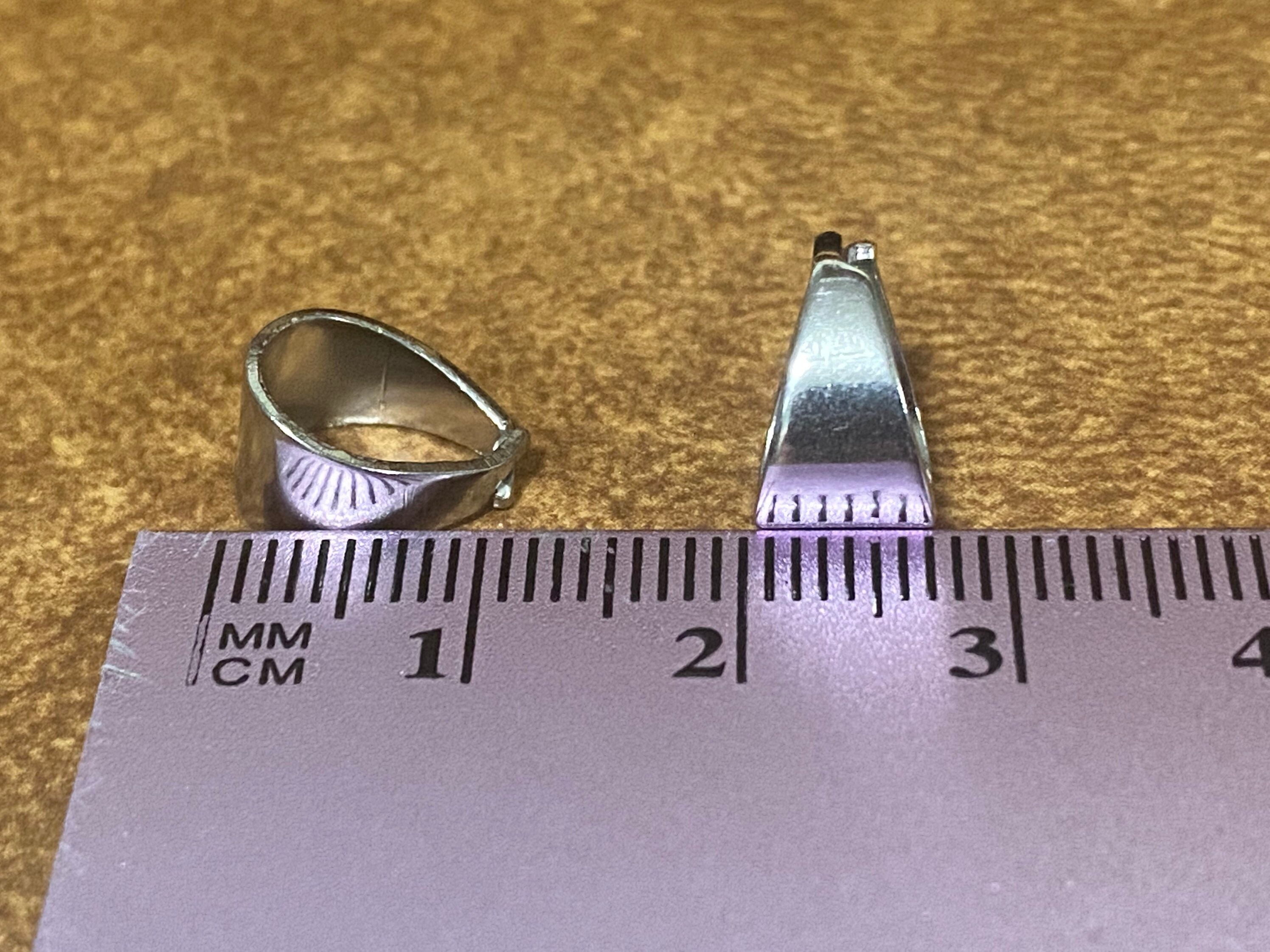 Outside measurement is about 12mm long, 8.5mm wide. Each prong is about 0.9mm thick. Inside measurement is about 9.5mm long, 6.5mm wide. Top of bail width is about 6.9mm