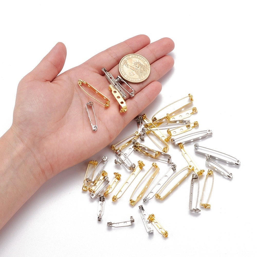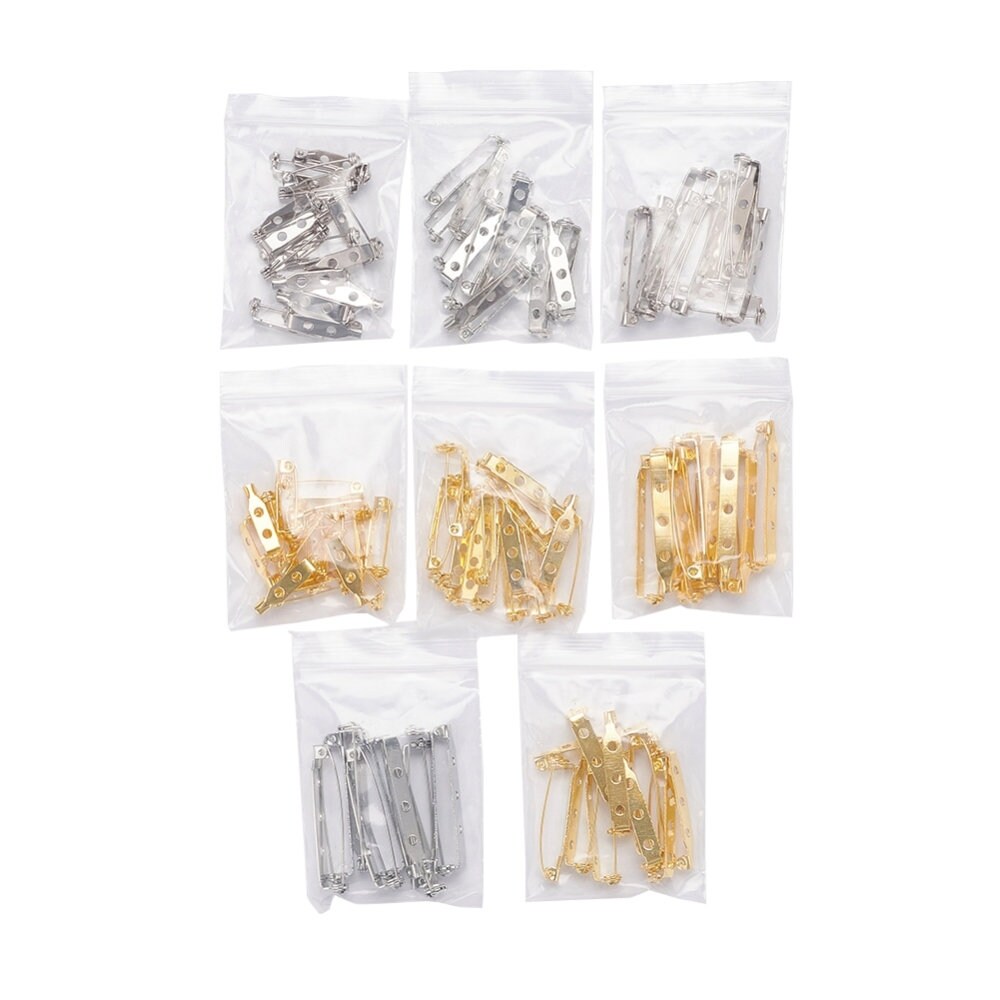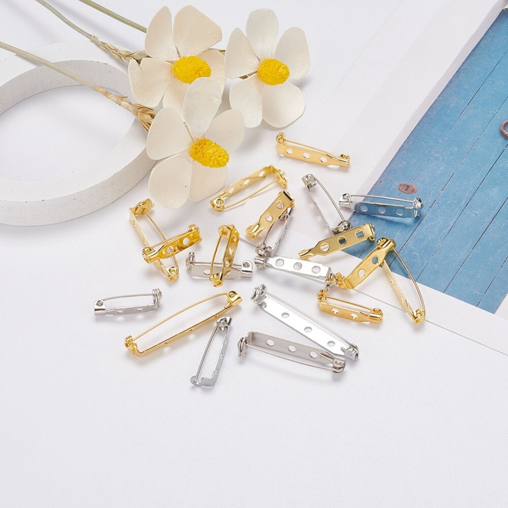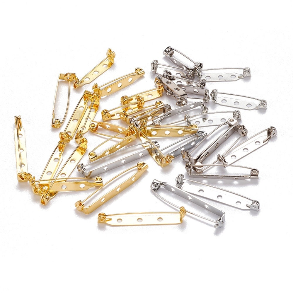 Design your own pins and broaches! This DIY Iron Pin Brooch Blank Bar Findings comes with about 100 pins. Pins are held in a reusable plastic storage container measuring 8.2x8.2x2.7cm. Kit comes with a mix of both gold and platinum colors.