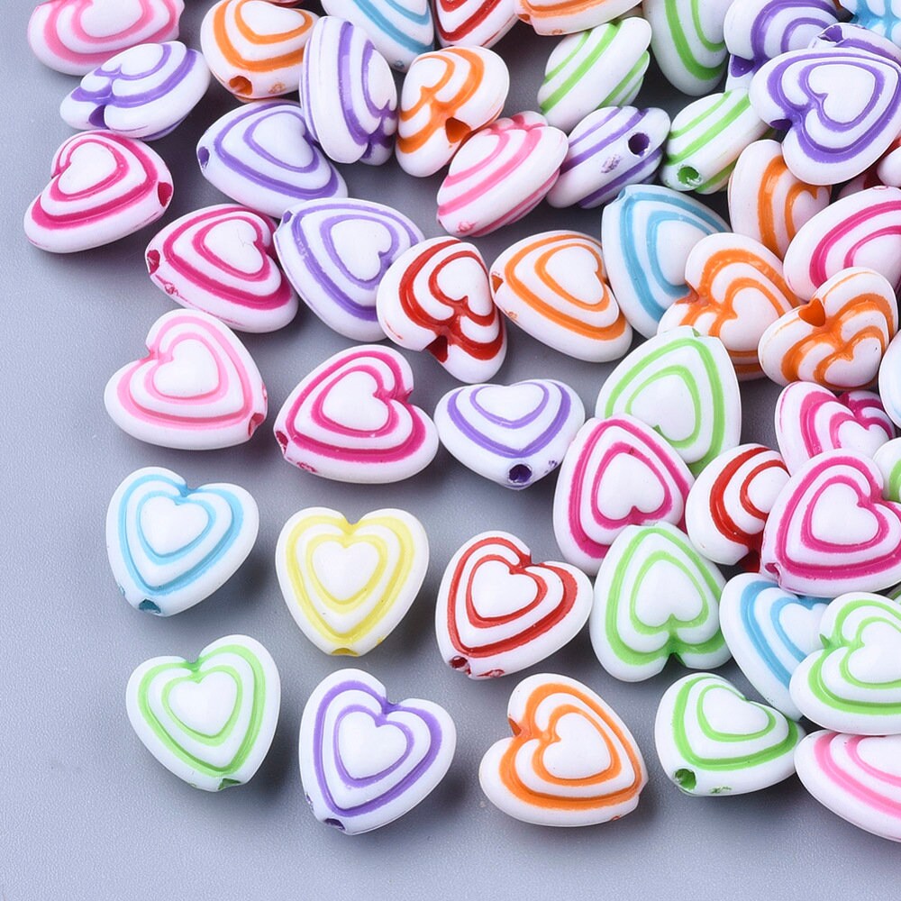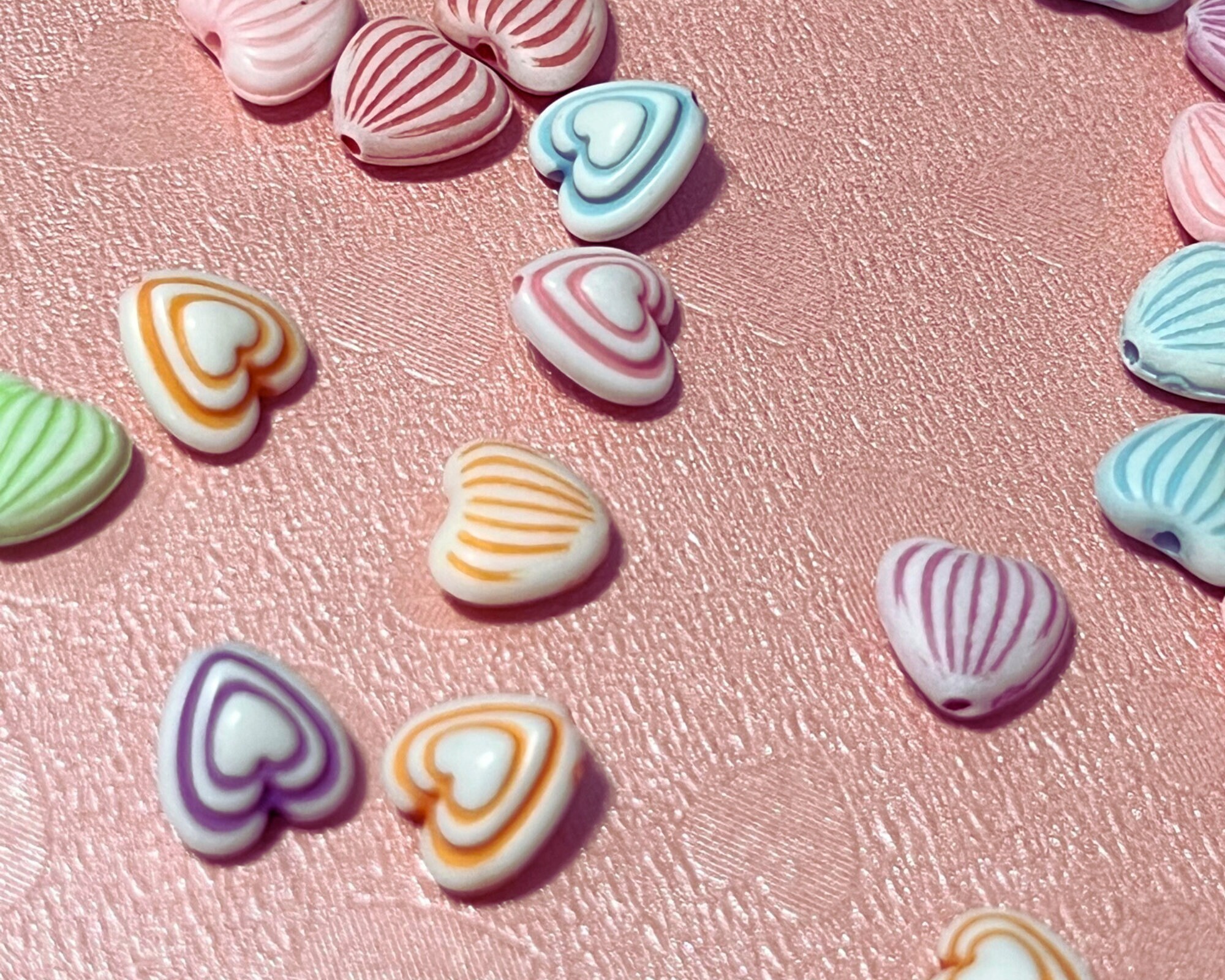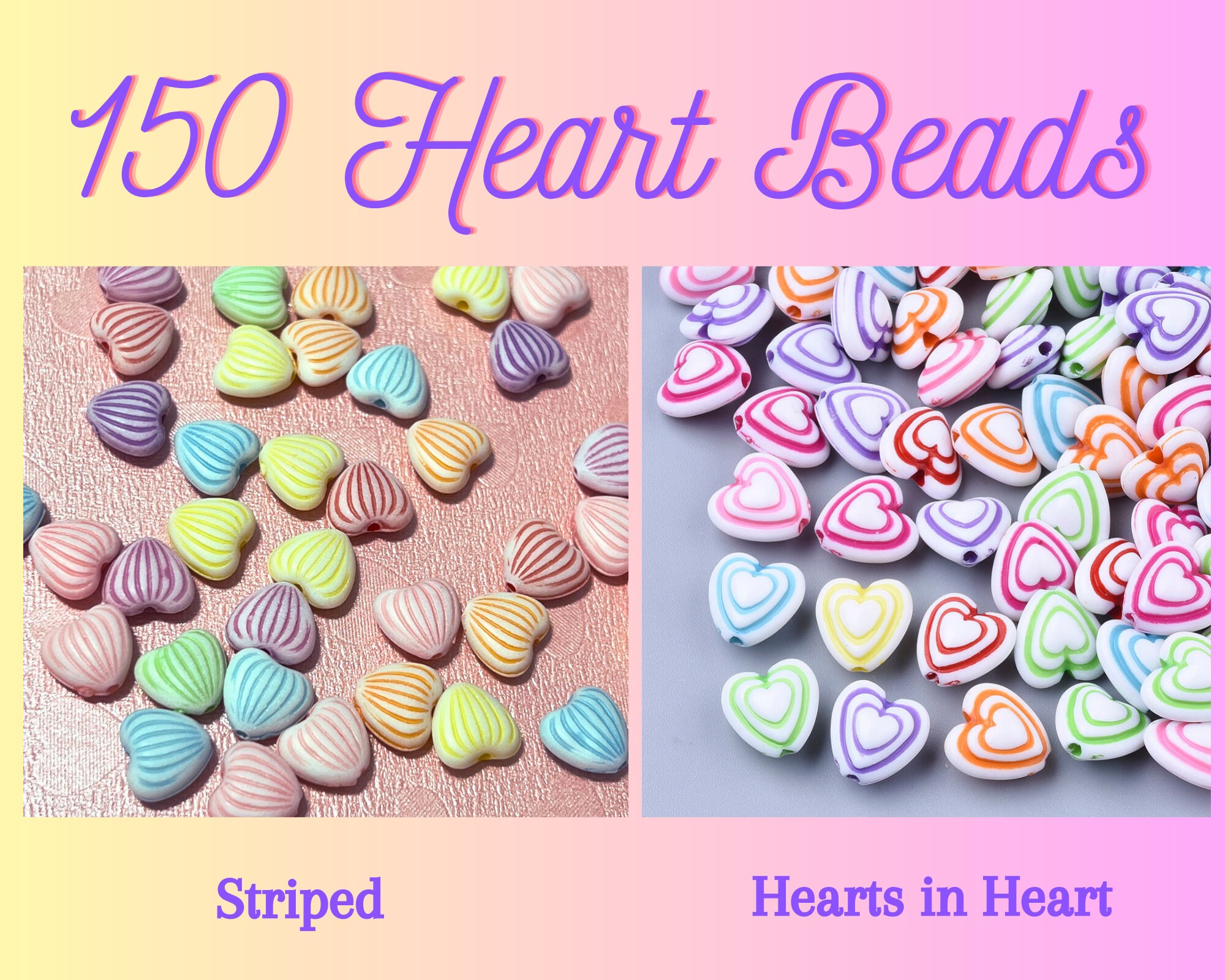 Approximately 150 beads per bag. Take your pick between the Striped or Hearts in Heart style beads. Hearts in Heart beads measure about 10mm long, 10mm wide, 6.5mm thick, hole: 1.6mm. Striped heart beads measure about 10mm long, 11mm wide, 5mm thick, Hole: 2mm.