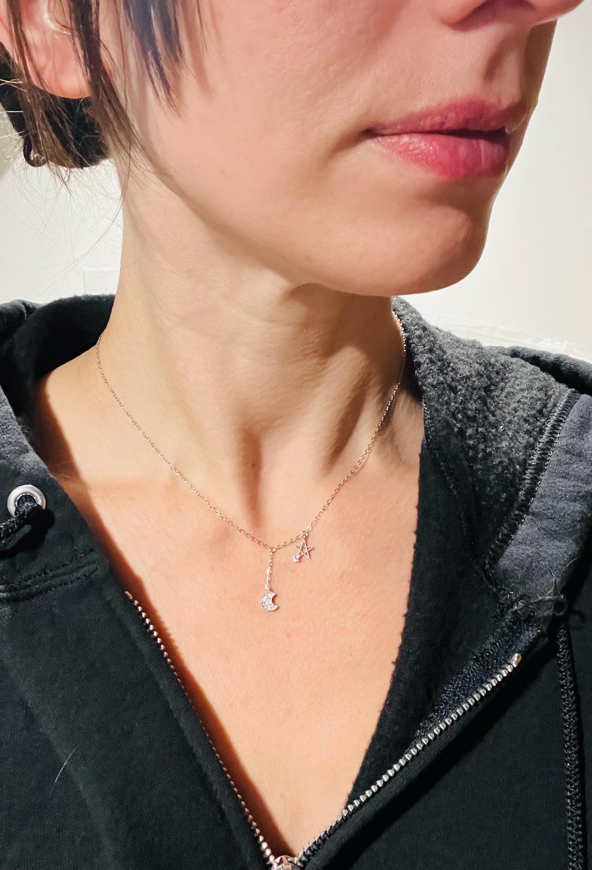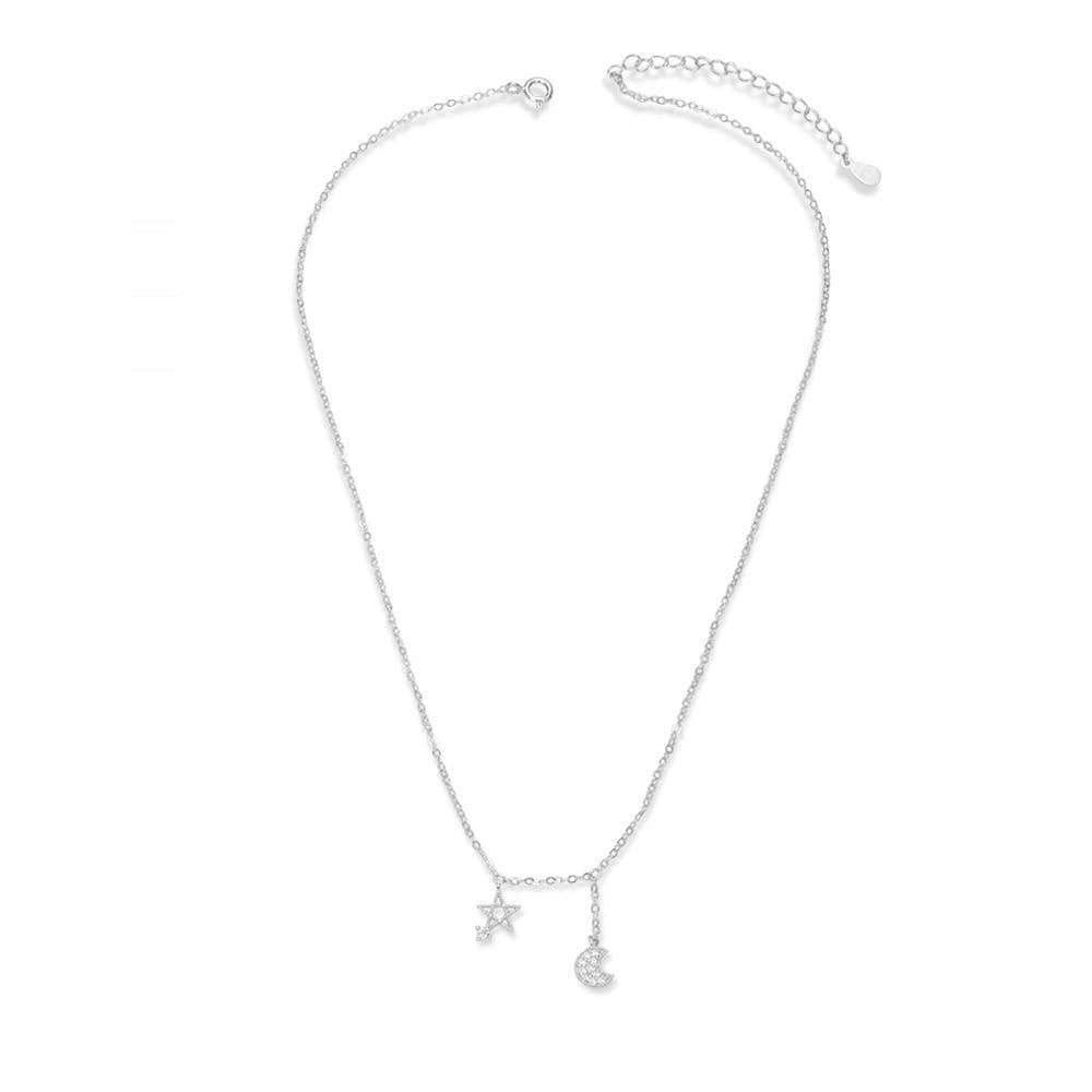 Rhodium Plated 925 Sterling Silver Moon and Star Pendant Necklace. Made with Micro Pave Grade AAA Cubic Zirconia. Necklace measures approximately 15.7 inches plus an additional 2inch extender chain for a total of about 17.7 inches in length. Pendants are elegant and small, measuring about 7-10mm.