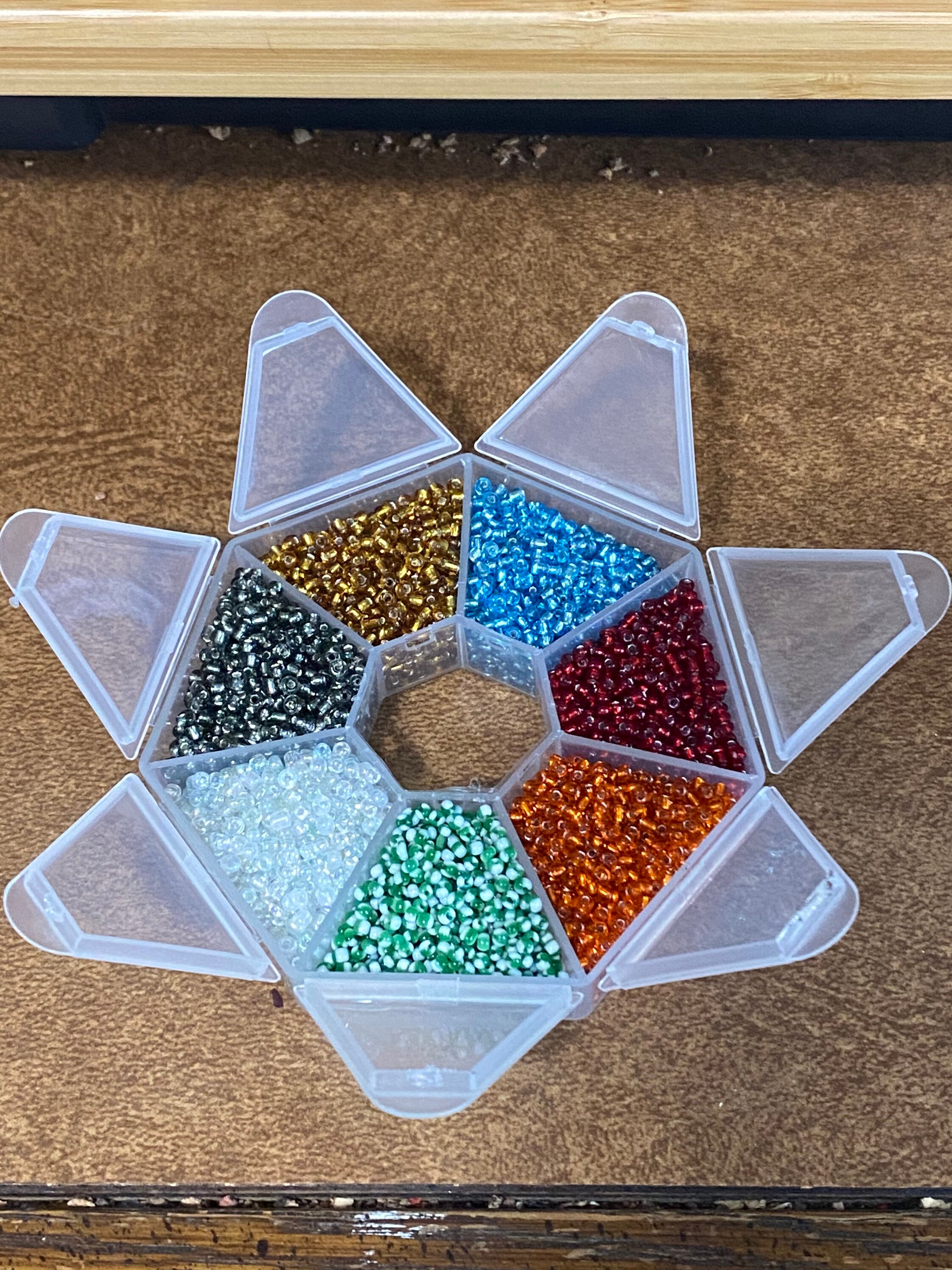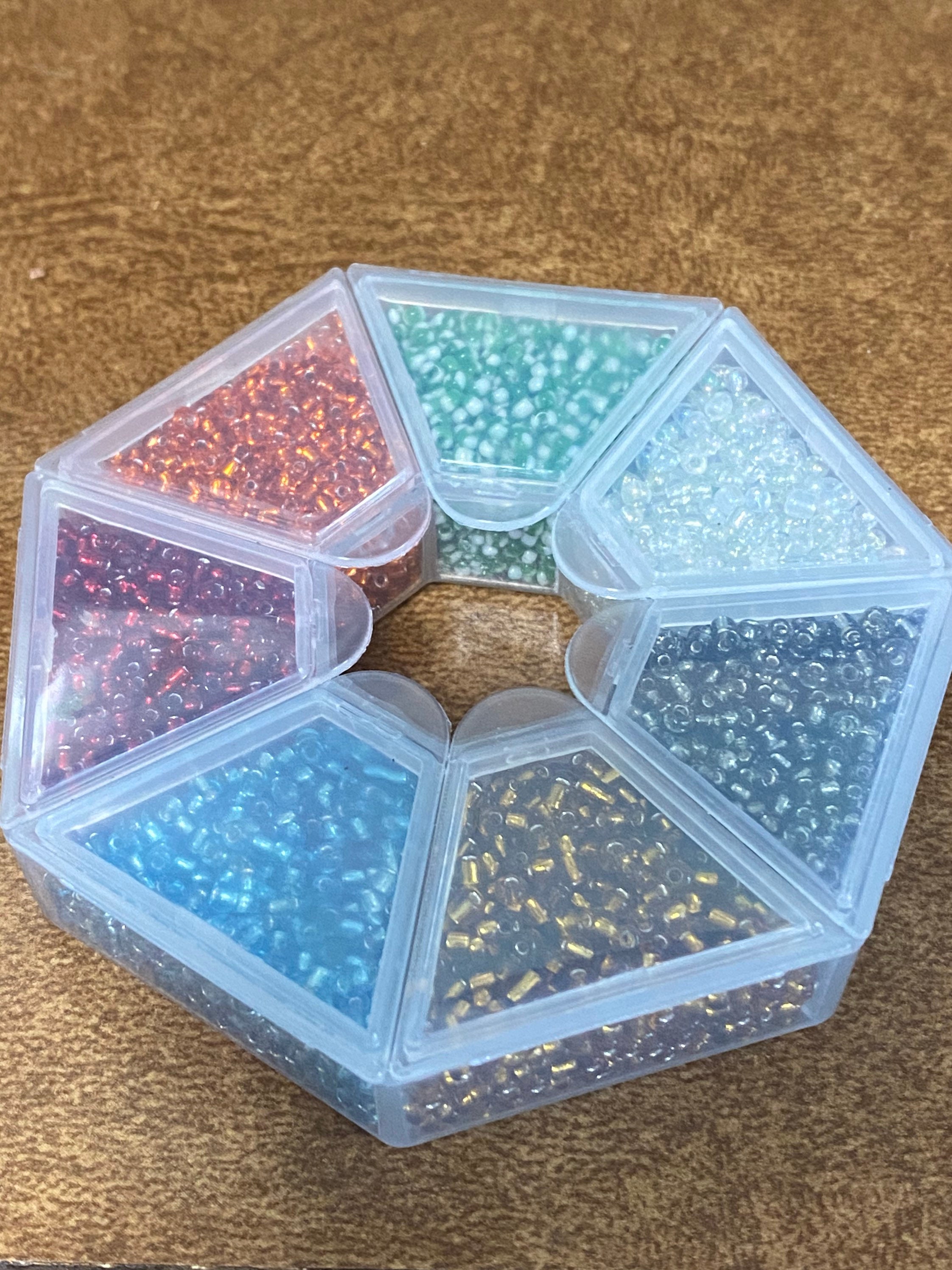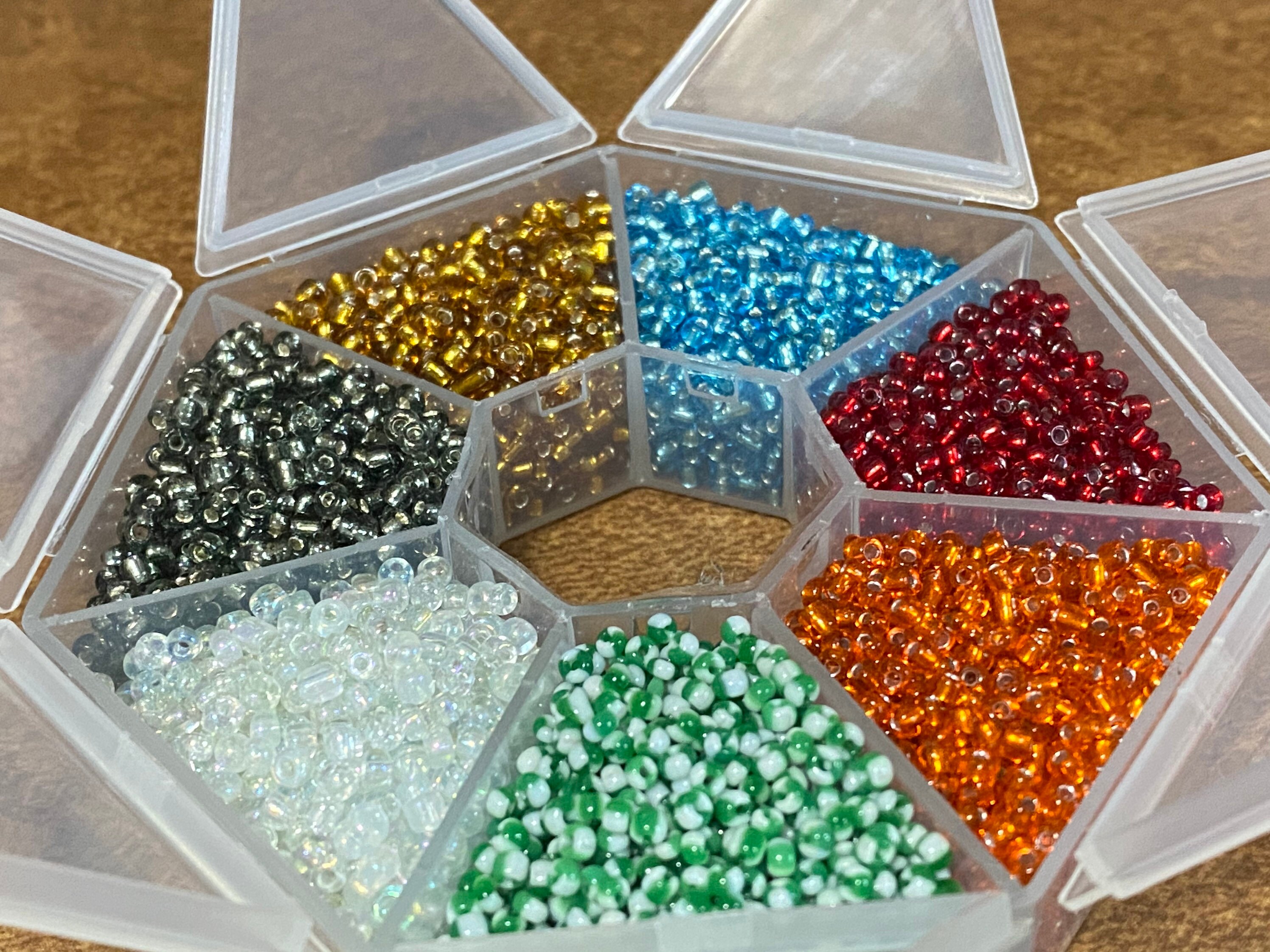 About 10 grams of each color seed bead. Size is 12/0. Colors include AB clear, orange, red, green and white stripes, black/gray, light blue, golden brown. Over 9,000 total seed beads. Comes in a convenient reusable storage container where each of the 7 compartments open separately.