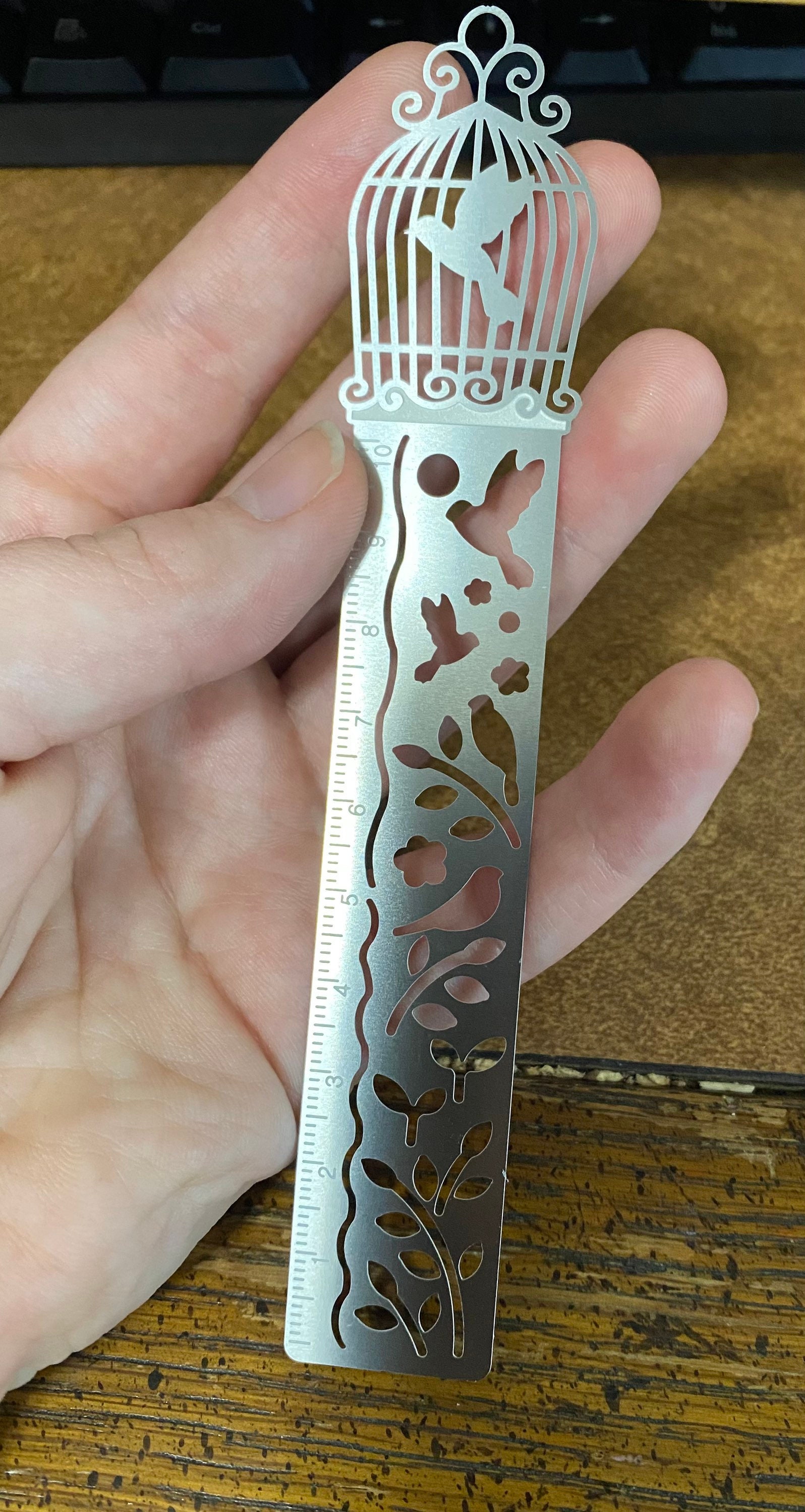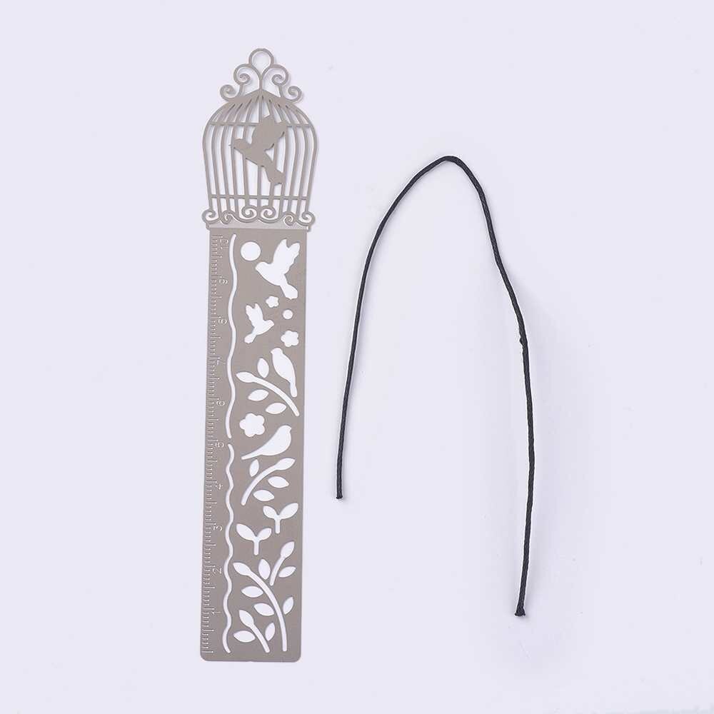 Adorable 3 in 1 Tool. Use as a bookmark, a stencil, or ruler. Ruler measures up to 10 cm. This birdcage designed ruler is Stainless Steel and therefore highly tarnish and rust resistant. Comes with a small cord to attach to ruler (optional).