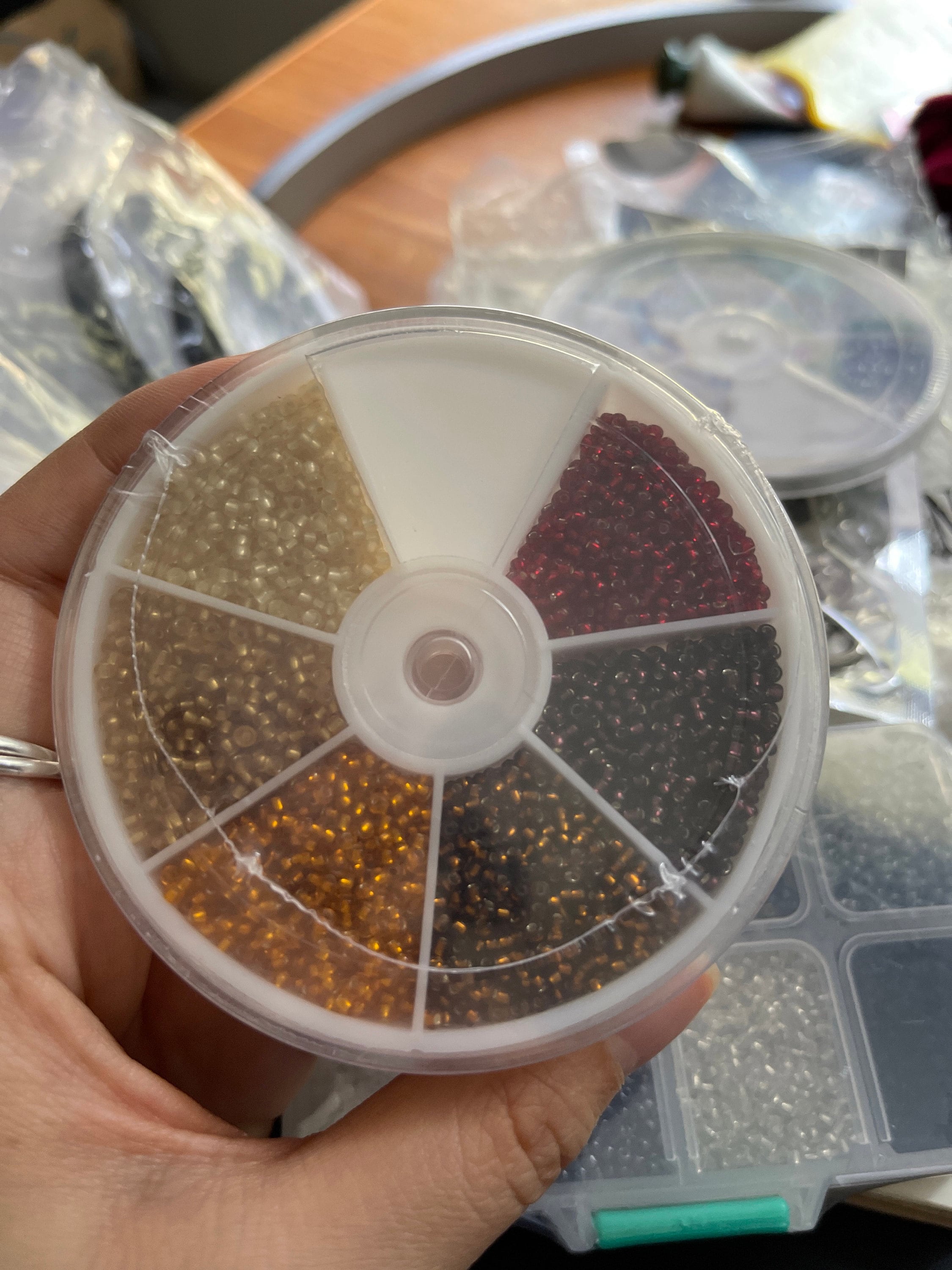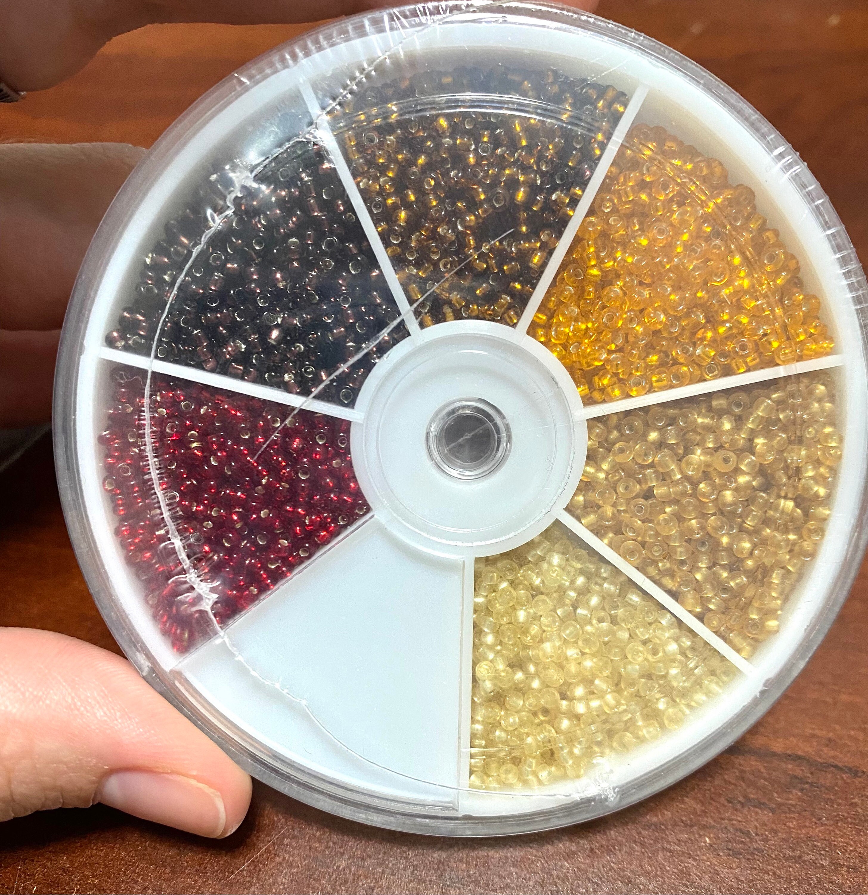 Round: 2x1.5mm, hole: 0.3mm; 6colors, about 360~400pcs/color, about 2160~2400pcs/box. Reusable Storage Container measures 8x1.2cm.