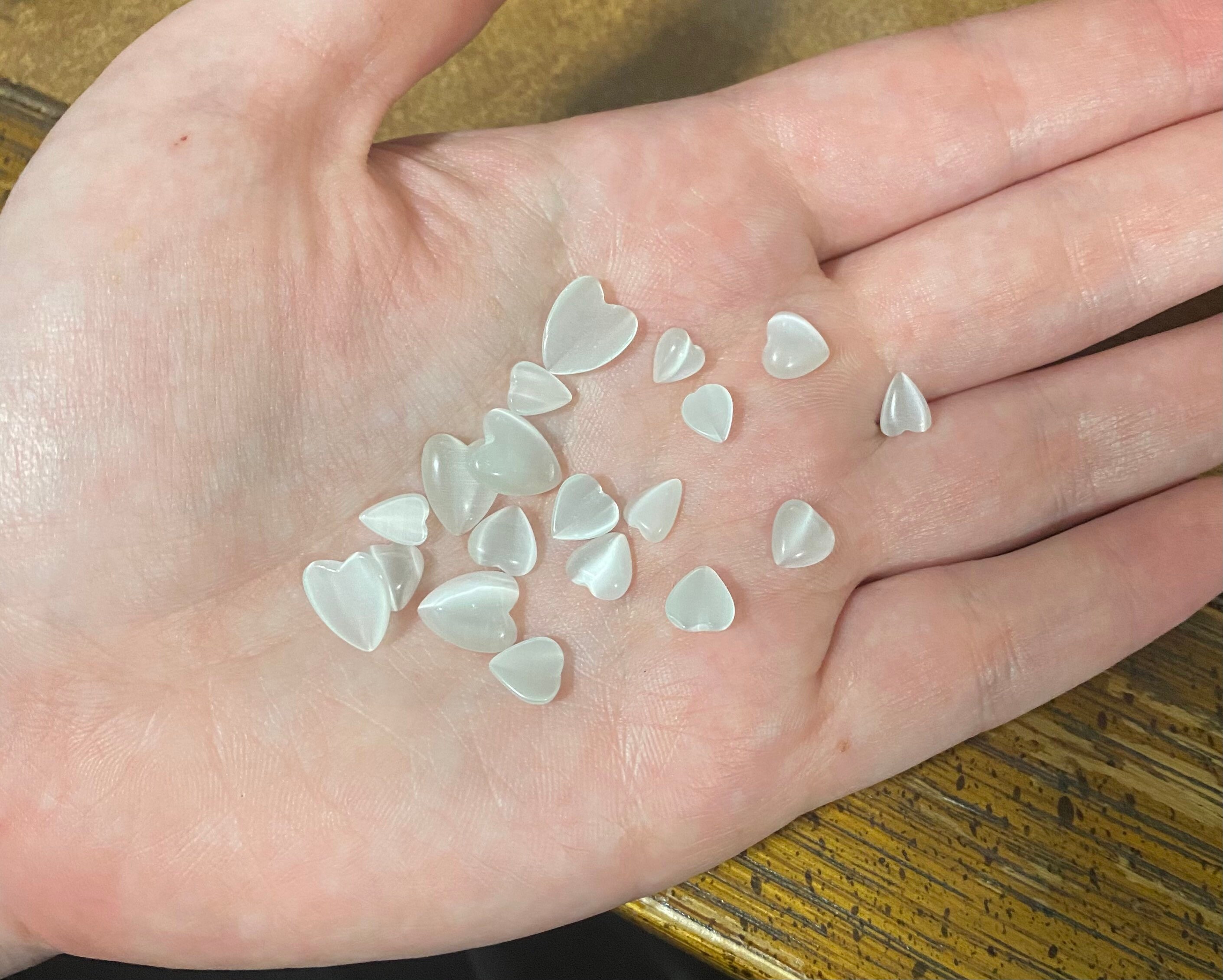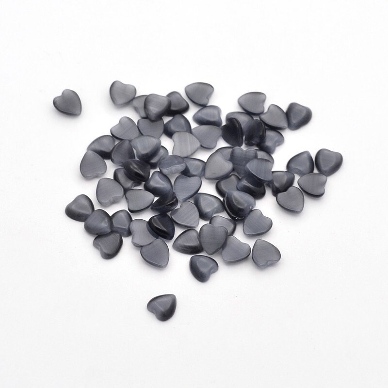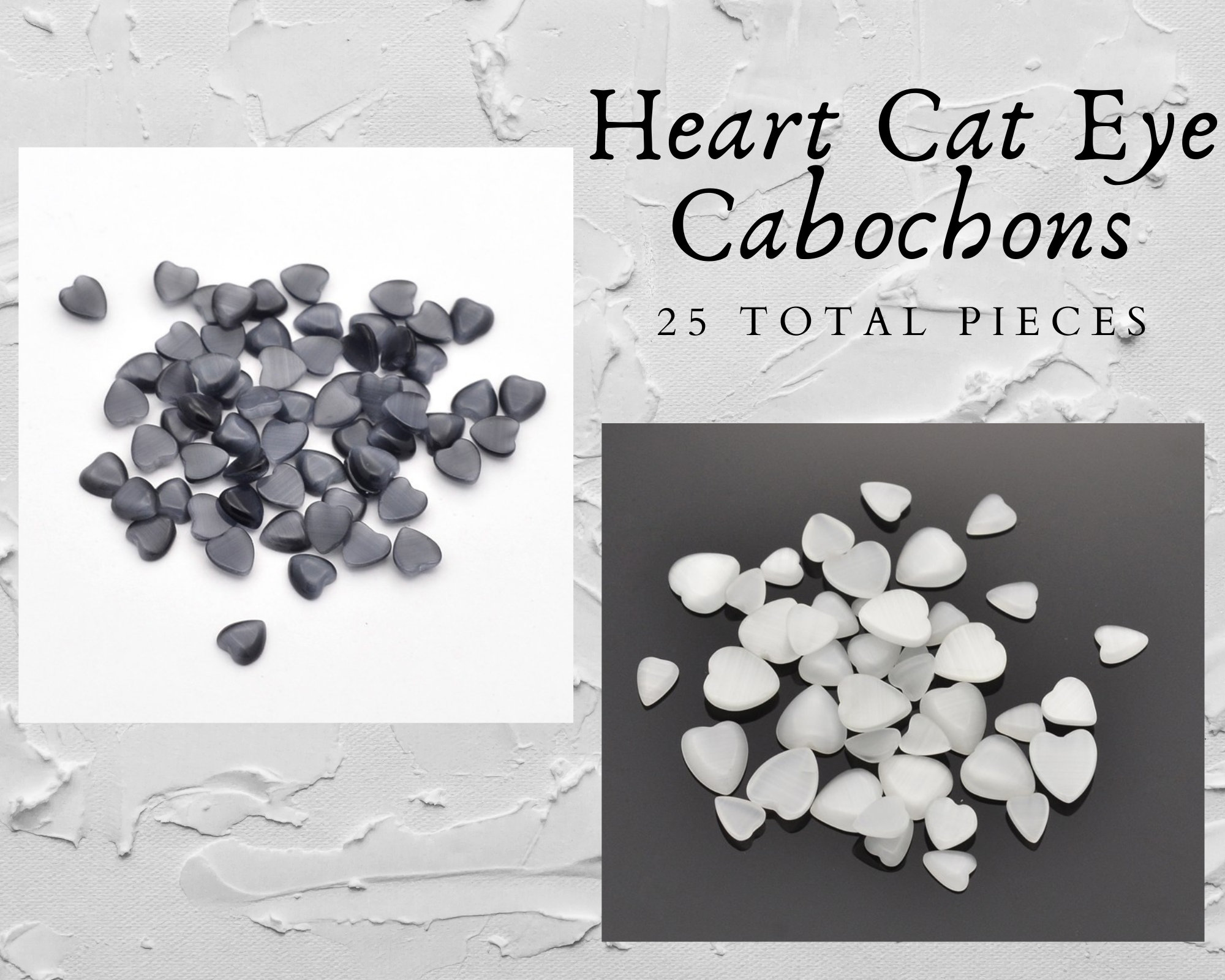25 Total Cat Eye Gemstone Heart Shaped Cabochons. Choose between Black/Grey and White Colors. White Heart Cat Eye Cabochons come in a variety of sizes. (6~10.5x5~9x2~2.5mm). Black/Grey Heart Cat Eye Cabochons come in one size measuring about 6x6x2mm