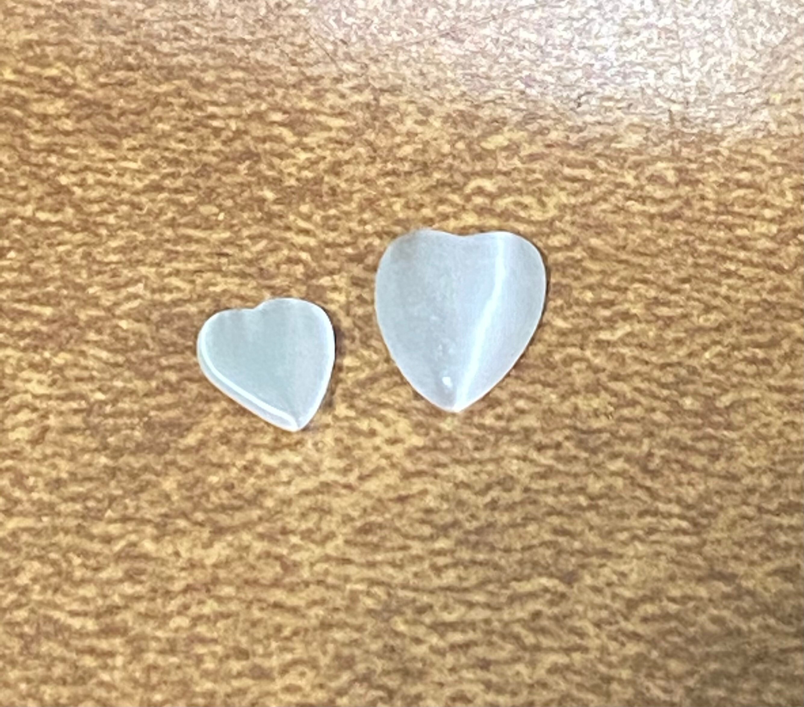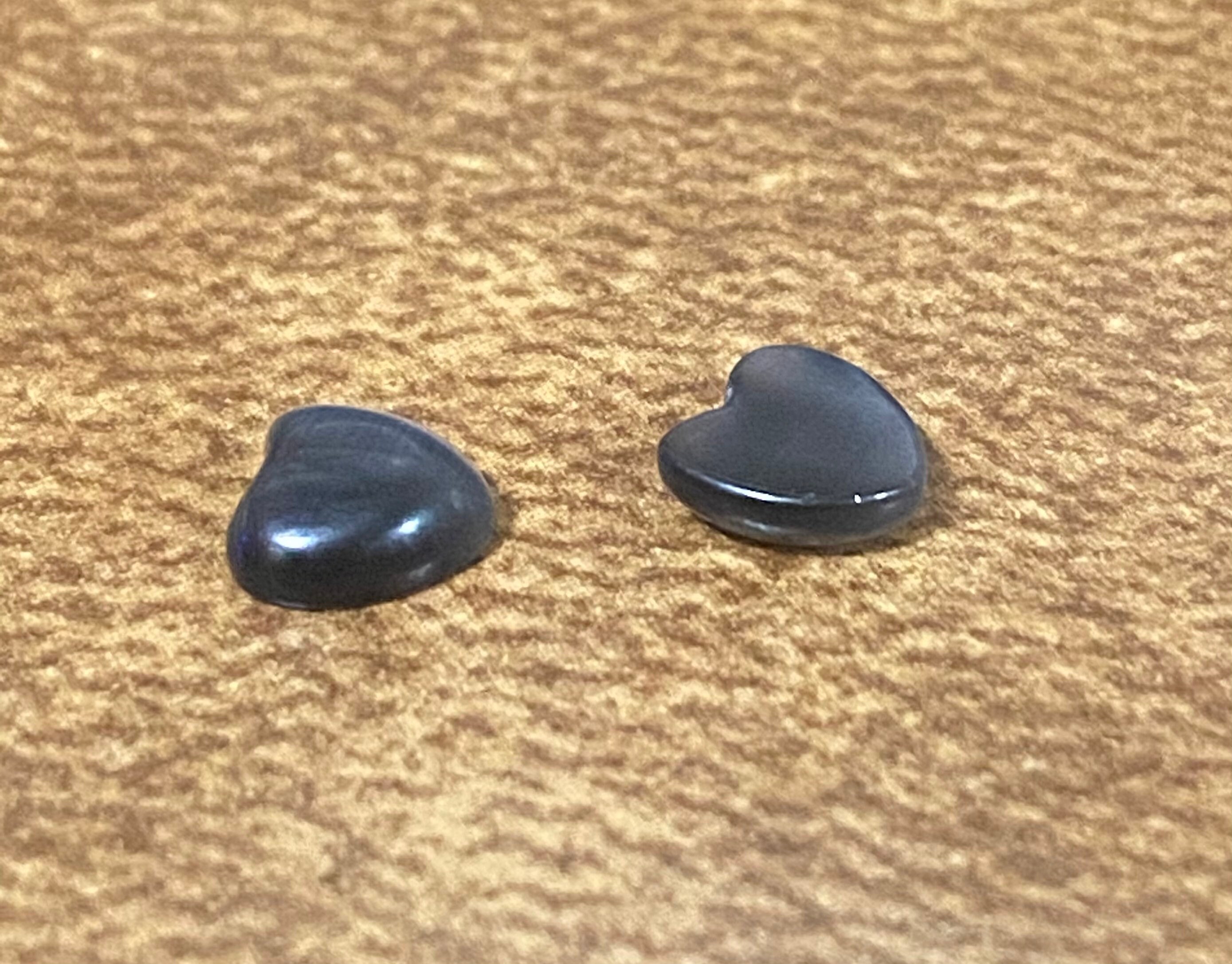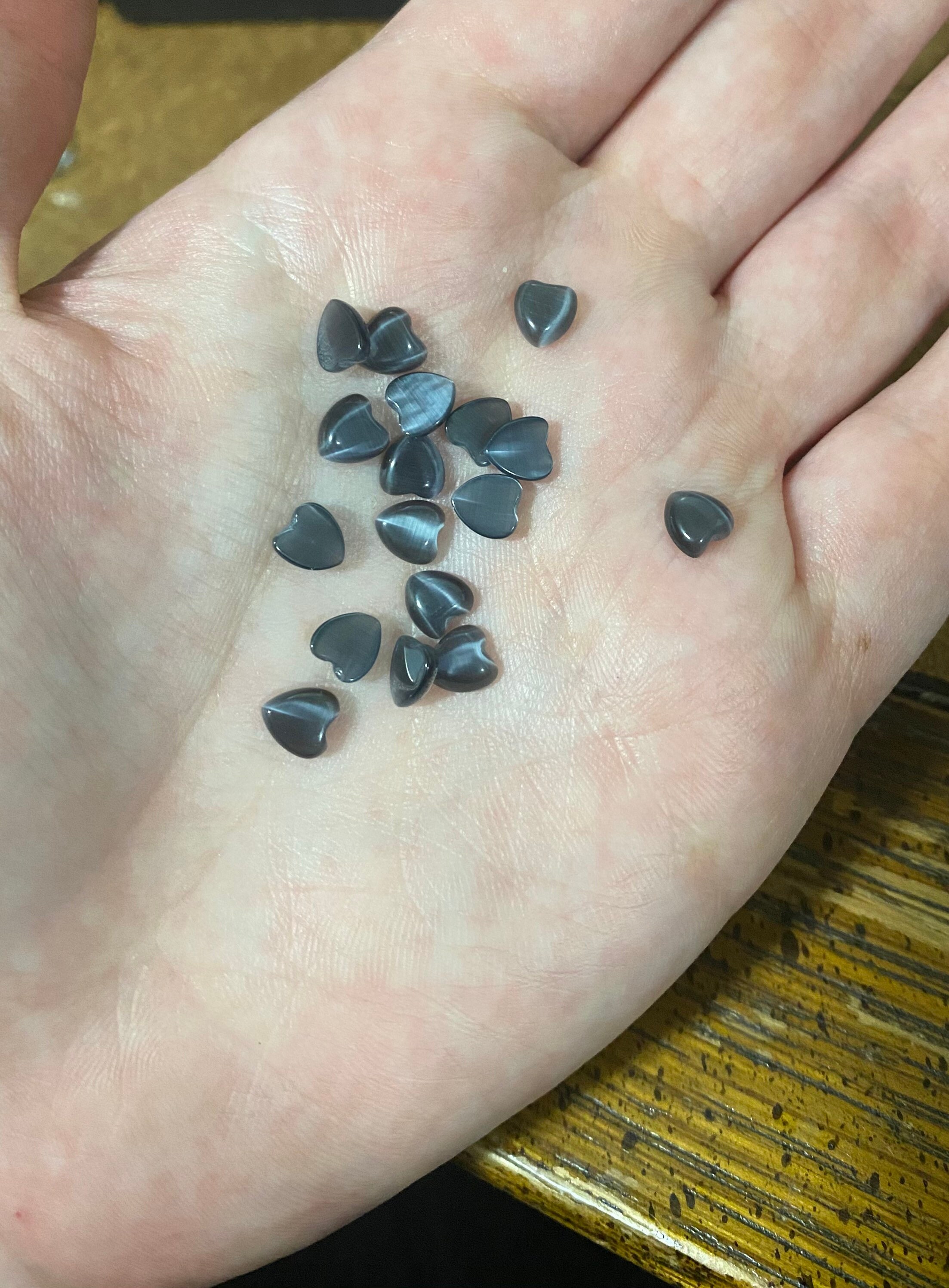 25 Total Cat Eye Gemstone Heart Shaped Cabochons. Choose between Black/Grey and White Colors. White Heart Cat Eye Cabochons come in a variety of sizes. (6~10.5x5~9x2~2.5mm). Black/Grey Heart Cat Eye Cabochons come in one size measuring about 6x6x2mm