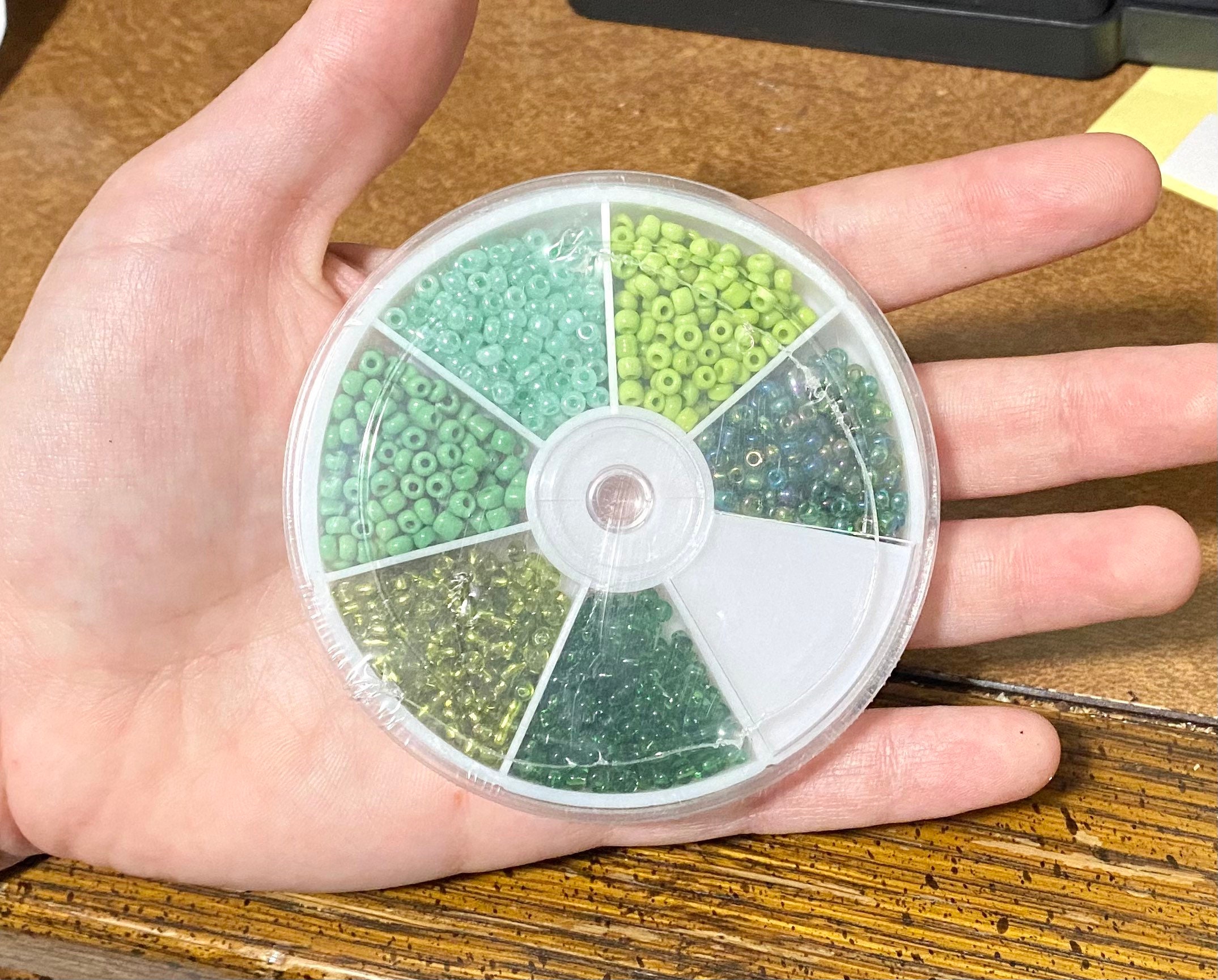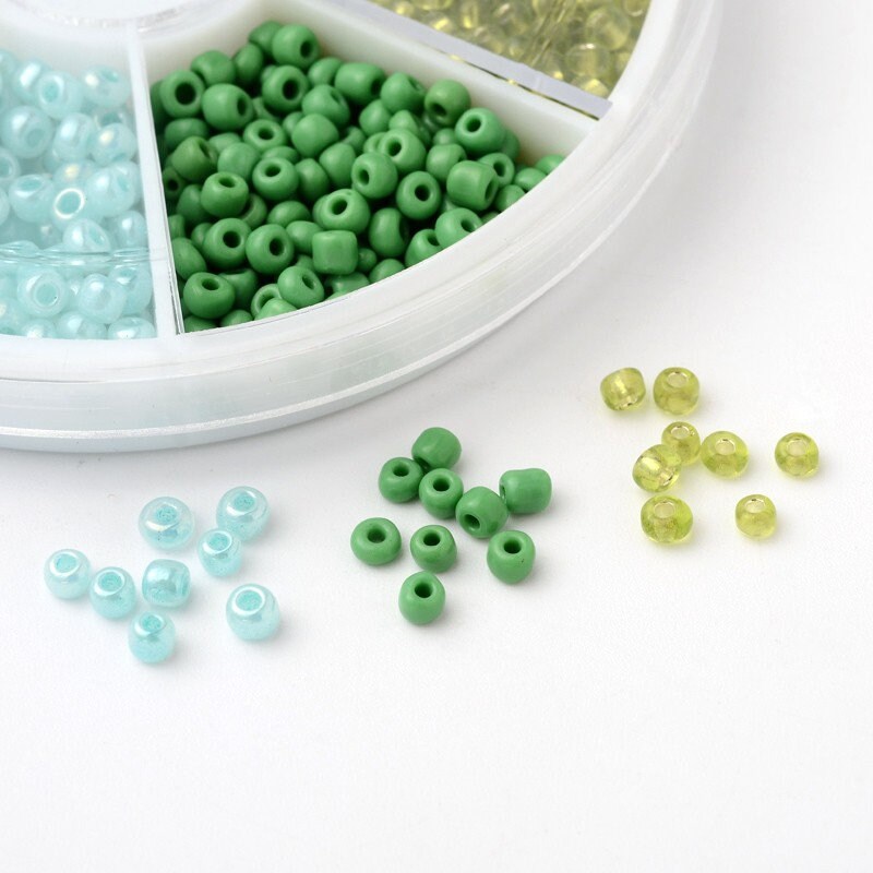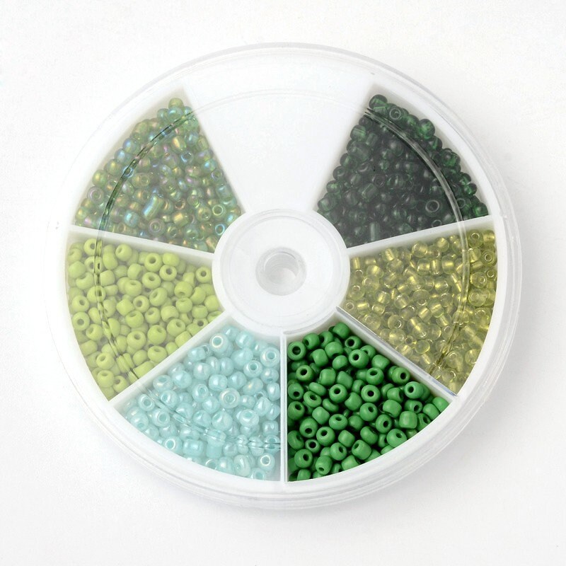6 Green Shade and Color Variety Seed Bead Kit. Size 8/0 Seed Beads. Measures about 3mm in diameter with a 1mm hole. About 1,270 beads with reusable container. Mix of styles including Ceylon, Transparent, Opaque, Light, Dark, Lime, Silver-lined, etc. Rotate the top of the container to the bead of your choosing.