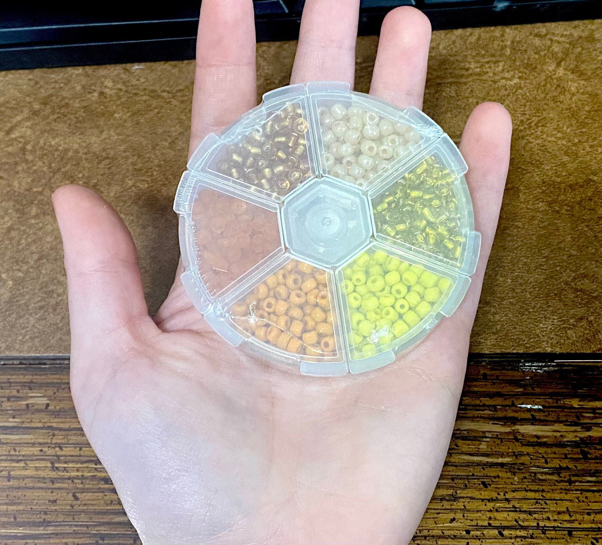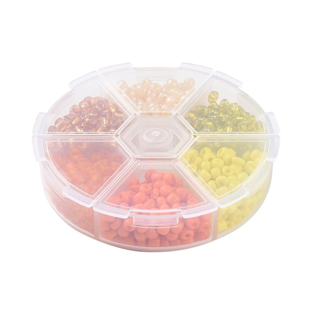 Size 6/0 Glass Seed Beads. Features colors and shades of the yellow and orange varieties. Beads are about 4mm in diameter with a 1-1.5mm hole. There are 10g/color equaling about 60grams per box. This seed bead kit contains about 600-900 beads. There is a mix of Opaque, Frosted, Lustered, and Transparent colors. Glass seed beads are a great addition to many different projects. Comes with a convenient reusable plastic storage container with 6 separate compartments. Storage box measures about 8x2cm.